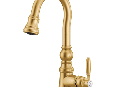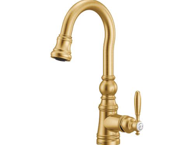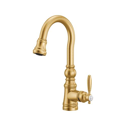 Moen®, S53004BG, Kitchen Faucet, Series: S53004, Weymouth™ Collection, 1.5 gpm Flow Rate, High-Arc Spout, 6-17/32 in Spout Reach, 8-13/16 in Spout Height, 68 in Hose, Lever Handle, 1 Handles, 1 Faucet Holes, 1-1/2 in Faucet Hole, 3/8 in Connection, Compression Connection, Spray Pattern: Aerated Stream, 2 Spray Functions, 2-1/2 in Maximum Deck Thickness, Deck Mounting, 1255 Duralast™, 14-21/32 in H Dimensions, Metal, Brushed Gold, Domestic