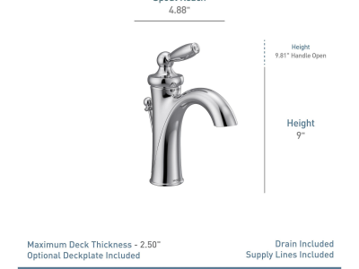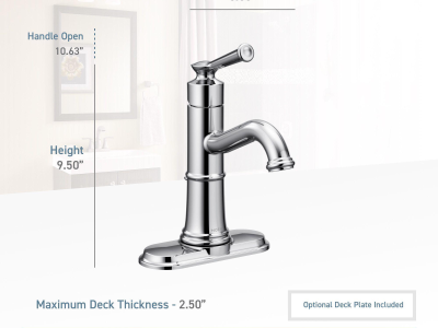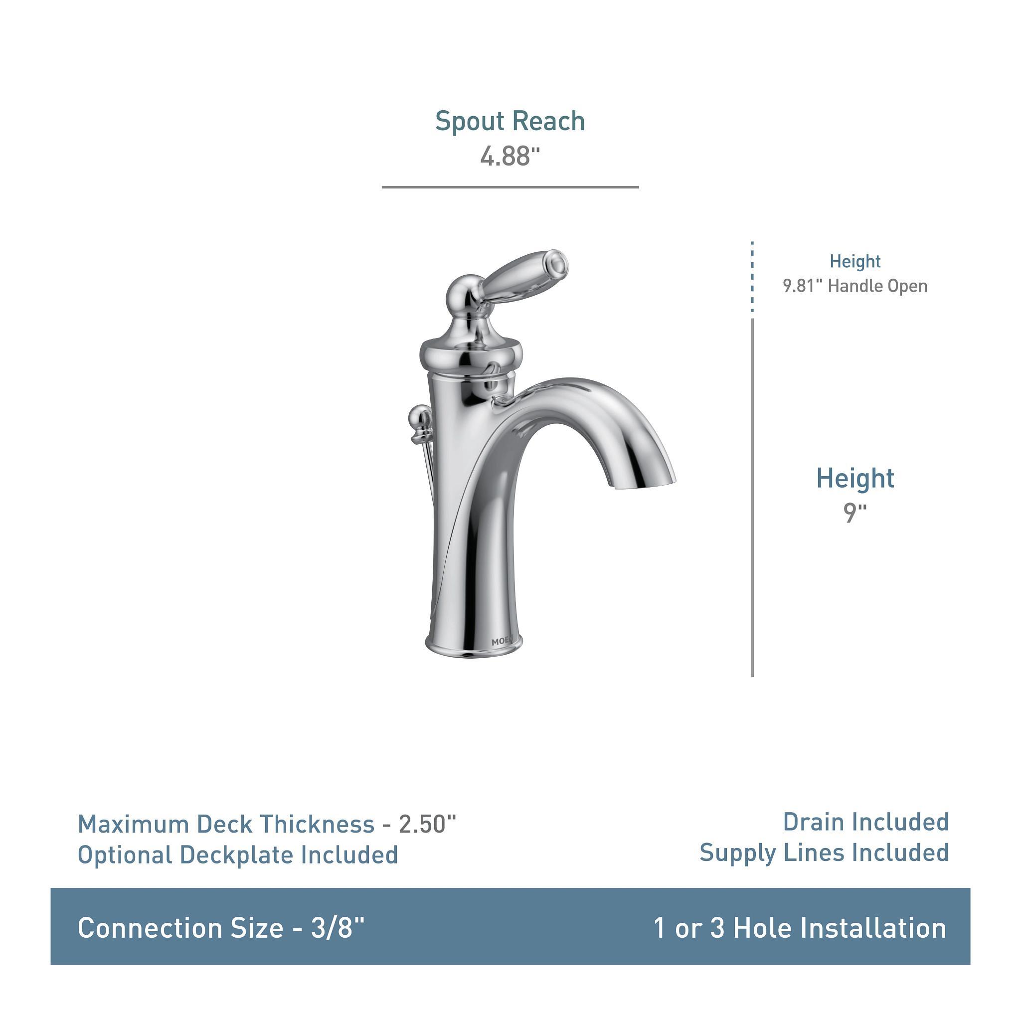 Moen® Bathroom Faucet, Belfield™ Collection, 1.2 gpm Flow Rate, High Arc Spout, 5-1/2 in Spout Reach, 4-7/8 in Spout Height, Lever Handle, 1 Handle, Lift Rod Drain, 1 Faucet Hole, 3/8 in Connection, Compression Connection, Spray Pattern: Aerated, 2-1/2 in Maximum Deck Thickness, Deck Mounting, 1255™ Duralast™ Cartridge, 9-1/2 in H Dimensions, Metal, Polished Nickel, Domestic, Commercial
