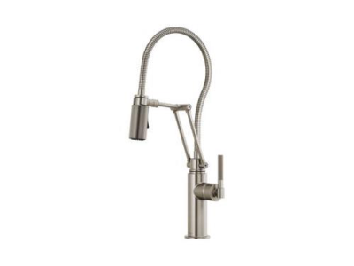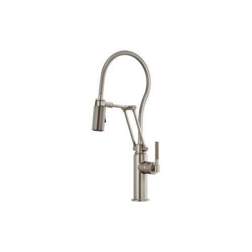 Brizo® Articulating Kitchen Faucet, Litze® Collection, 1.8 gpm Flow Rate, 360 deg Swivel Spout, 7-1/8 in Spout Reach, 23 in Hose, Knurled Lever Handle, 1 Handle, 1 Faucet Hole, 1-1/4 to 1-1/2 in Faucet Hole, 3/8 in Connection, Compression Connection, Spray Pattern: Aerated Stream/Spray, Function: Traditional, 2 Spray Functions, 3 in Maximum Deck Thickness, Deck Mounting, Ceramic Cartridge, 4.5 in L x 2.44 in W x 21.5 in H Dimensions, Stainless Steel, Commercial