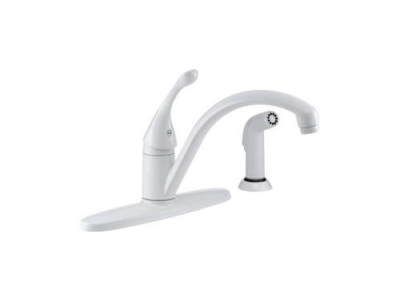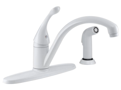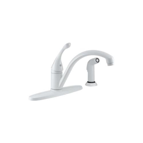 DELTA® Kitchen Faucet, Collins™ Collection, 1.8 gpm Flow Rate, 8 in Center Distance, Swivel Spout, 9-3/16 in Spout Reach, 5-1/8 in Spout Height, 45 in Hose, Lever Handle, 1 Handles, Side Spray(Y/N): Yes, 4 Faucet Holes, 1-15/16 to 1-1/2 in Faucet Hole, 3/8 in Connection, Compression Connection, Spray Pattern: Full Body, 1 Spray Functions, 2-1/2 in Maximum Deck Thickness, Deck Mounting, Euro-Motion DIAMOND™ Seal Valve, Brass, White, Domestic