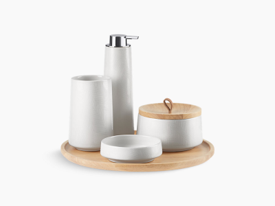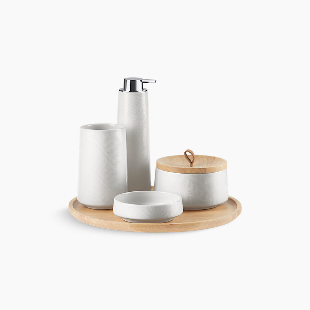 This Artist Editions Bente(TM) accessory collection enhances the beauty and organization of the bathroom countertop space. This five-piece set includes a ceramic soap dispenser, tumbler, lidded canister, soap dish and wooden tray. Each piece was thoughtfully designed to nest together on the wooden tray or be used individually in a multitude of spaces throughout the home. Unique material elements and finishes are beautifully incorporated into the collection. The Herringbone pattern strikes modern, geometric notes and complements both transitional and contemporary spaces. Delight in the details of your home with Kohler.