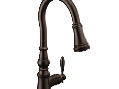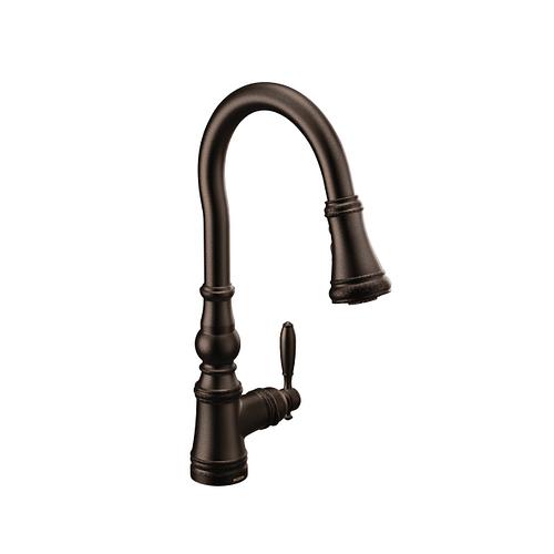 Moen®, S73004ORB, Kitchen Faucet, Series: S73004, Weymouth™ Collection, 1.5 gpm Flow Rate, High-Arc Spout, 7-61/64 in Spout Reach, 9-3/16 in Spout Height, 68 in Hose, Lever Handle, 1 Handles, 1 Faucet Holes, 1-1/2 in Faucet Hole, 3/8 in Connection, Compression Connection, Spray Pattern: Boosted Rinse, Powerful Cleaning Rinse, Aerated Stream, Boosted Stream, 4 Spray Functions, 2-1/2 in Maximum Deck Thickness, Deck Mounting, 1255 Duralast™, 16-47/64 in H Dimensions, Metal, Oil Rubbed Bronze, Domestic