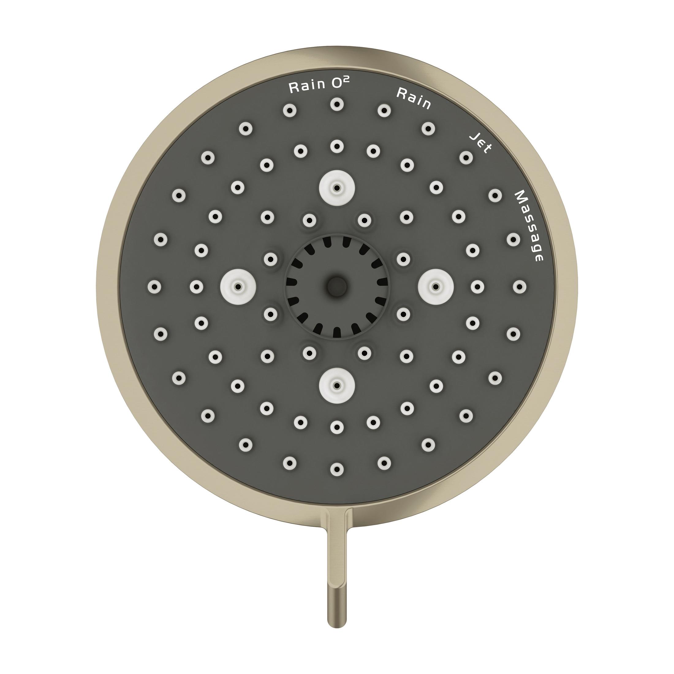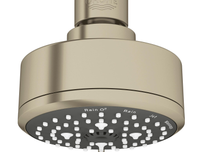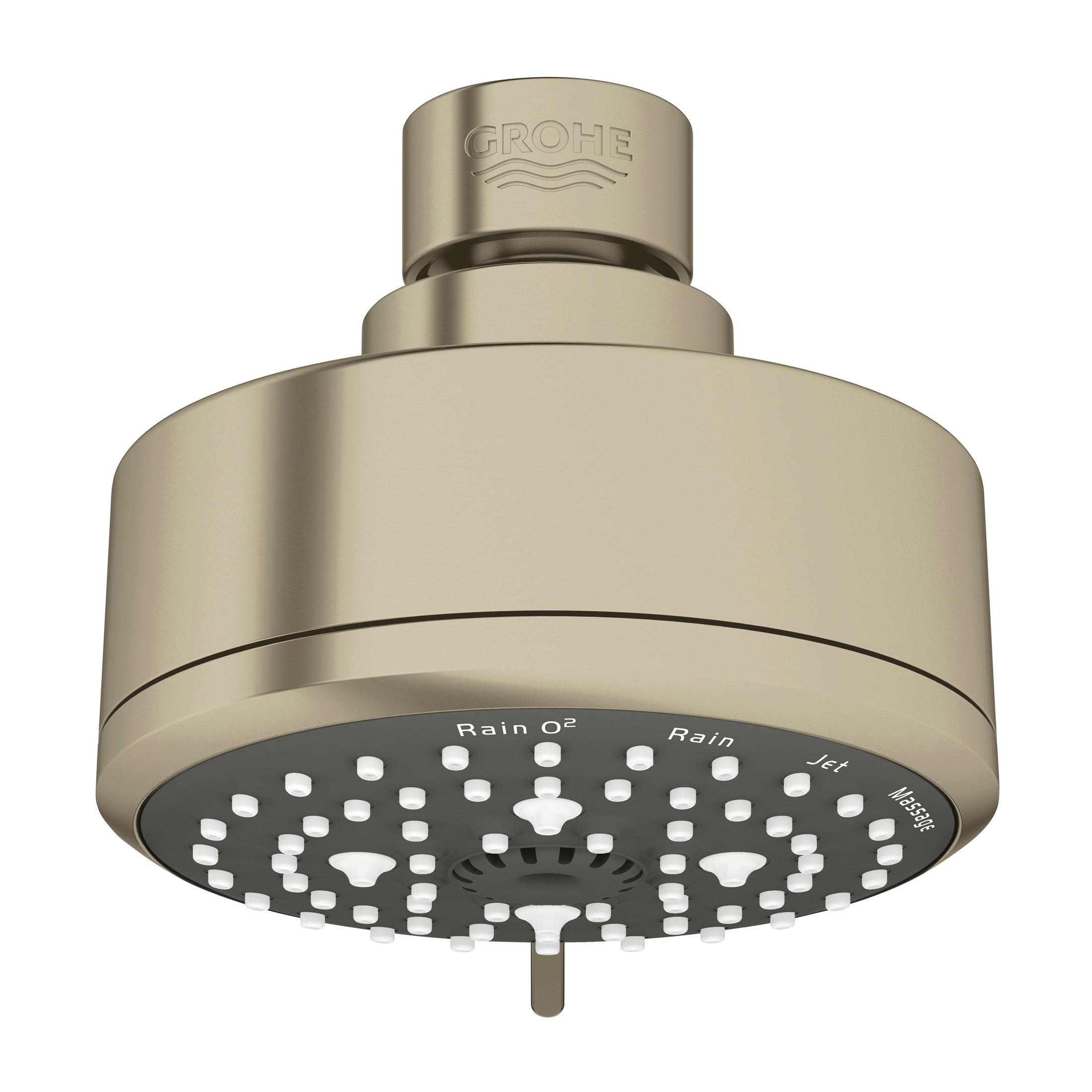 GROHE Shower Head, New Tempesta Cosmopolitan 100 Collection, 1.75 gpm Maximum, 1/2 in NPT Connection, 4 Sprays, Spray Pattern: Rain O2/Rain/Massage/Jet, 15 psi Pressure, 3-15/16 in Dia Head, 3-5/16 in Overall Height, Brushed Nickel, Import