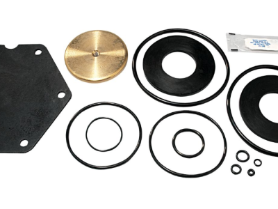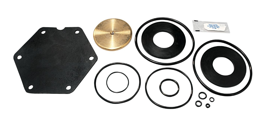 This total rubber parts kit is used for replacing or repairing the relief valve assembly on a lead free reduced pressure backflow assembly used to prevent the reverse flow of polluted water from entering into the potable water supply due to backsiphonage and or backpressure. This kit consists of a diaphragm, two molded disc assemblies, two seat O-rings, RV O-ring, two piston O-rings, RV stem O-ring, flow tube O-ring and cover O-ring.