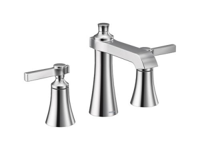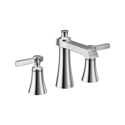 Moen®, TS6984, Bathroom Faucet, Widespread, Flara™ Collection, 1.2 gpm Flow Rate, 8 to 16 in Center Distance, High-Arc Spout, 5.8 in Spout Reach, 4-3/4 in Spout Height, Lever Handle, 2 Handles, Lift Rod Drain, 3 Faucet Holes, 1/2 in Connection, IPS Connection, Spray Pattern: Aerated Stream, 1-1/4 in Maximum Deck Thickness, Deck Mounting, 1234™ Duralast™ Cartridge, 7 in H Dimensions, Metal, Chrome, Domestic, Commercial Commercial/Residential