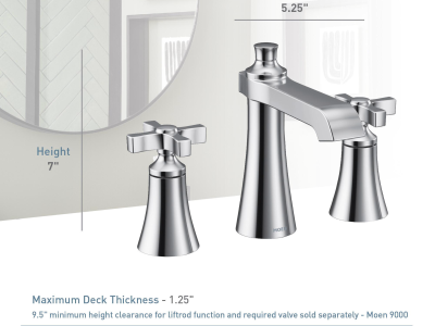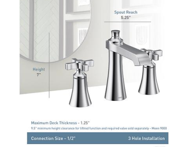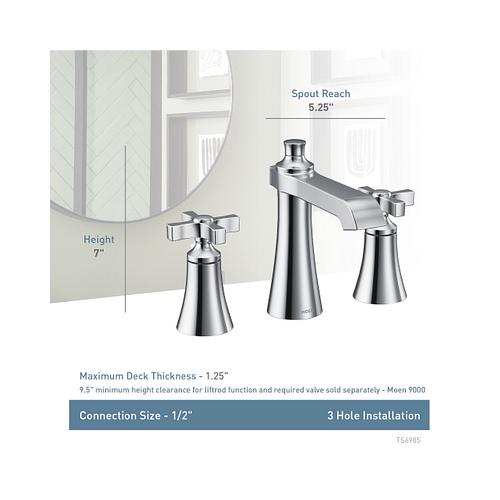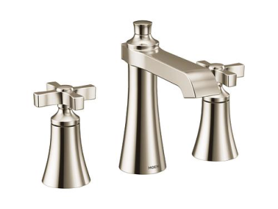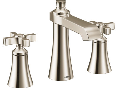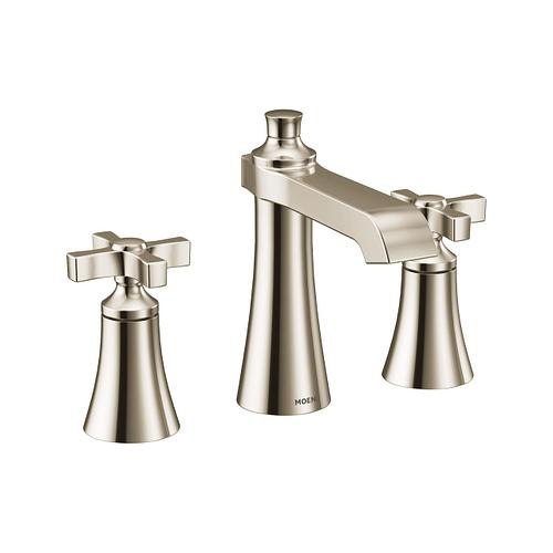 Moen®, TS6985NL, Bathroom Faucet, Widespread, Flara™ Collection, 1.2 gpm Flow Rate, 8 to 16 in Center Distance, High-Arc Spout, 5.8 in Spout Reach, 4-3/4 in Spout Height, Cross Handle, 2 Handles, Lift Rod Drain, 3 Faucet Holes, 1/2 in Connection, IPS Connection, Spray Pattern: Aerated Stream, 1-1/4 in Maximum Deck Thickness, Deck Mounting, 1234™ Duralast™ Cartridge, 7 in H Dimensions, Metal, Polished Nickel, Domestic, Commercial Commercial/Residential