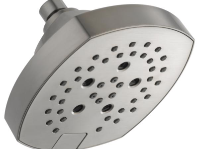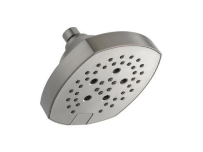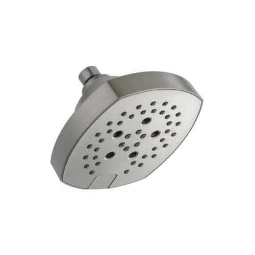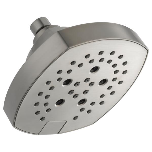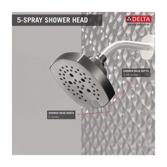 DELTA®, 52663-SS, Shower Head, Universal, 1.75 gpm Maximum, 1/2-14 NPT Connection, Squared Shape, 5 Sprays, Spray Pattern: Full Body, Full Body With Massage, Massaging, Pause, H2Okinetic®, 80 psi Pressure, 3-15/16 in Overall Length, 6 in Overall Width, 6 in Overall Height, ABS, Brilliance® Stainless Steel, Import