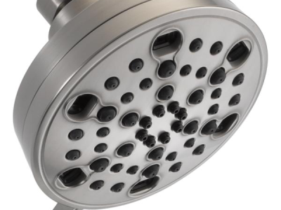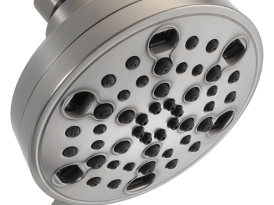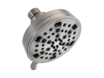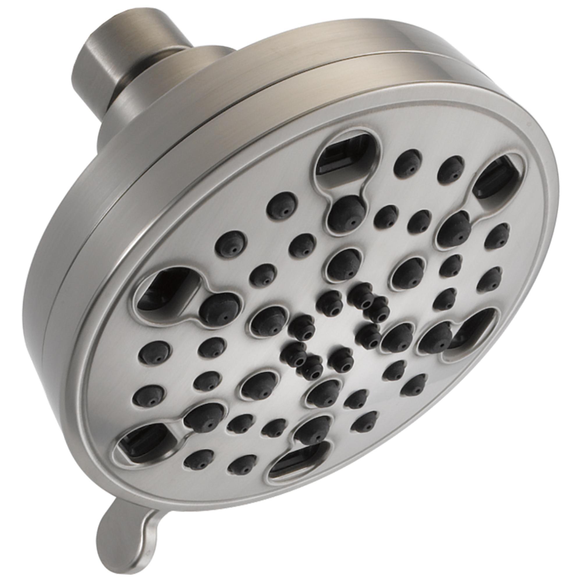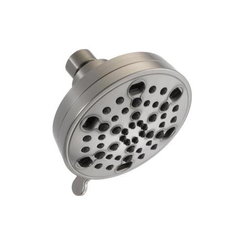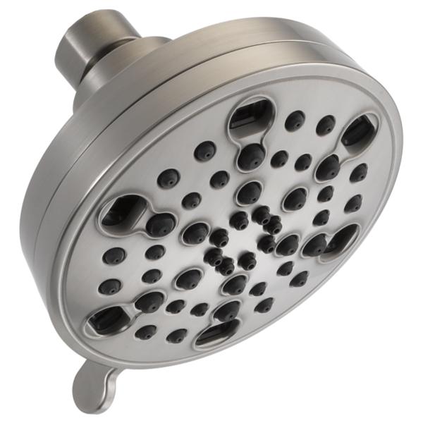 DELTA® Showerhead, Contemporary, 1.75 gpm Minimum, 1/2 in Connection, 5 Sprays, Spray Pattern: Full Body/Full Body With Massage/H2OKinetic®/Massage/Pause, 80 psi Pressure, 4-3/16 in Dia Head, 3-1/4 in Overall Height, Stainless Steel, Import