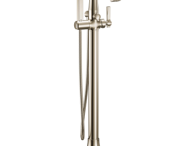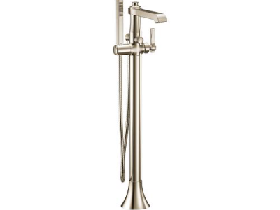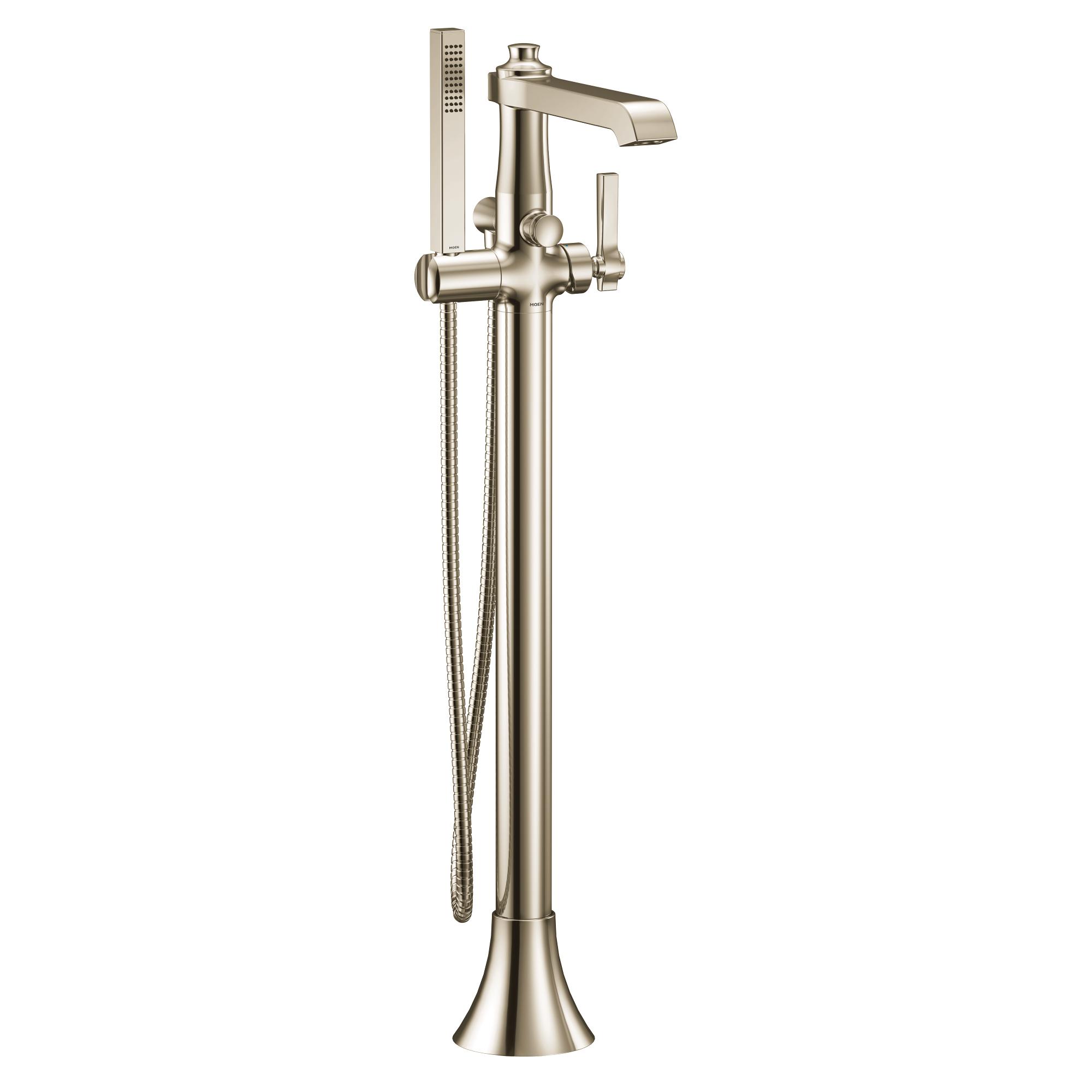 Moen®, S931NL, Tub Filler Faucet, Premium Floor Mount, Flara™ Collection, 10.71 in Spout Reach, 34 to 37 in Spout Height, 59 in L Hose, Lever Handle, 1 Handles, 1 Faucet Holes, 1/2 in Connection, CC/NPT Connection, 1 Spray Functions, Hand Shower: Yes, Integral Dual Check Valve, 35-3/8 to 38-3/8 in H Dimensions, Metal, Polished Nickel, Domestic, Commercial Commercial/Residential