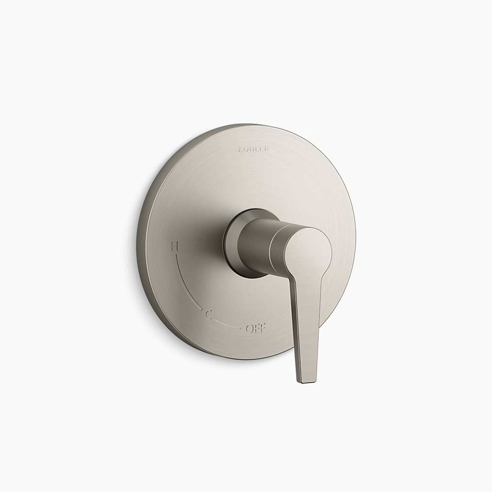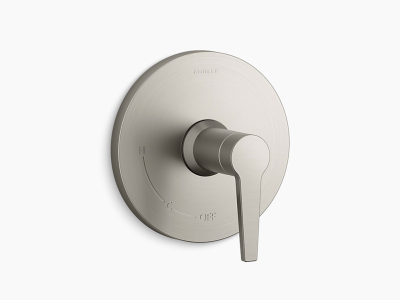 Pitch(TM) showering components feature a sleek, simple design that pairs beautifully with the full range of KOHLER(R) contemporary faucet collections. Complete this shower trim with a showerhead and a Rite-Temp(R) pressure-balancing valve, which maintains your desired water temperature during pressure fluctuations.