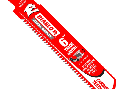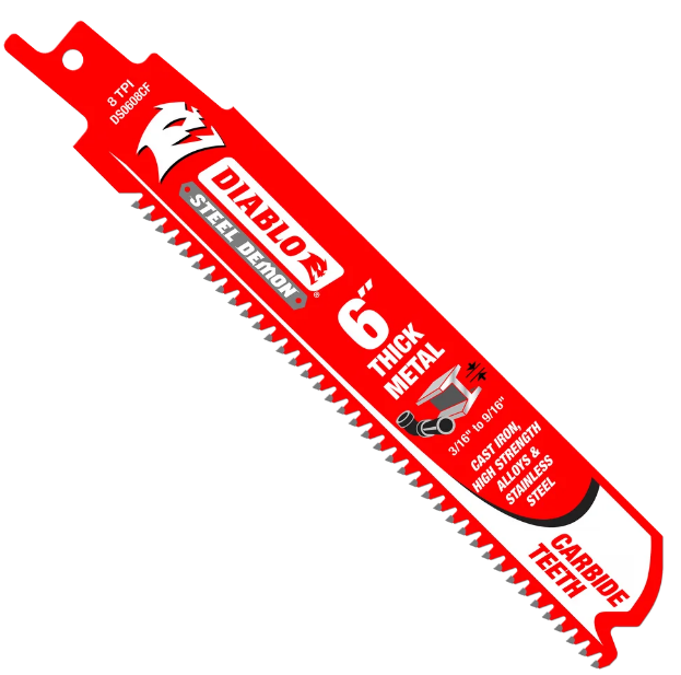 The Diablo Steel Demon Carbide tipped reciprocating blades are the first carbide tipped blades designed for extreme metal cutting; including high strength alloys, cast iron, and stainless steel. This high performance carbide tipped blade delivers unmatched 50 times longer cutting life than standard bi-metal blades in extreme thick metal cutting applications from 3/16 inch to 9/16 inch.