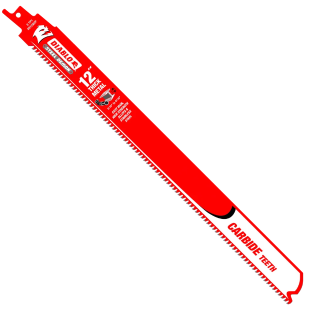 The Diablo Steel Demon Carbide tipped reciprocating blades are the first carbide tipped blades designed for extreme metal cutting; including high strength alloys, cast iron, and stainless steel. This high performance carbide tipped blade delivers unmatched 50 times longer cutting life than standard bi-metal blades in extreme thick metal cutting applications from 3/16 inch to 9/16 inch.