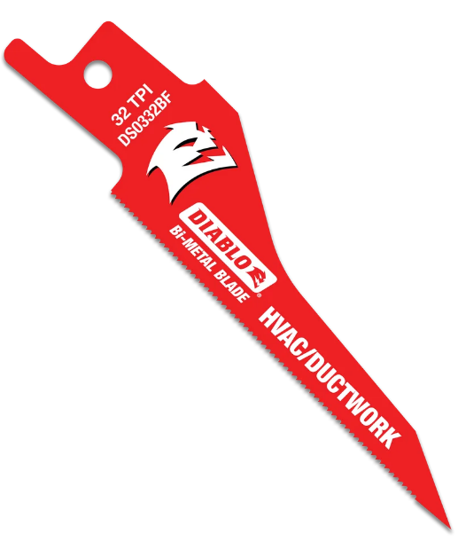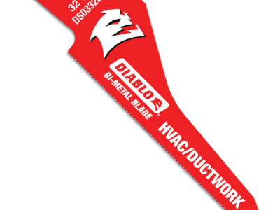 Diablo's new 3-1/4 inch 32 TPI HVAC/Ductwork bi-metal reciprocating saw blades are specifically designed for the trades to deliver maximum performance in thin metal cutting applications. An ultra-hardened cutting edge delivers up to 5X longer life than those of standard blades. The compact blade body and fast puncture tip design allow users to easily engage in the material without additional tools. A higher tooth count configuration and small gullets enables the blades to quickly slice through thin metals with ease while limiting excessive vibration. Perma-SHIELD non-stick coating prevents gumming and friction in metal cutting.