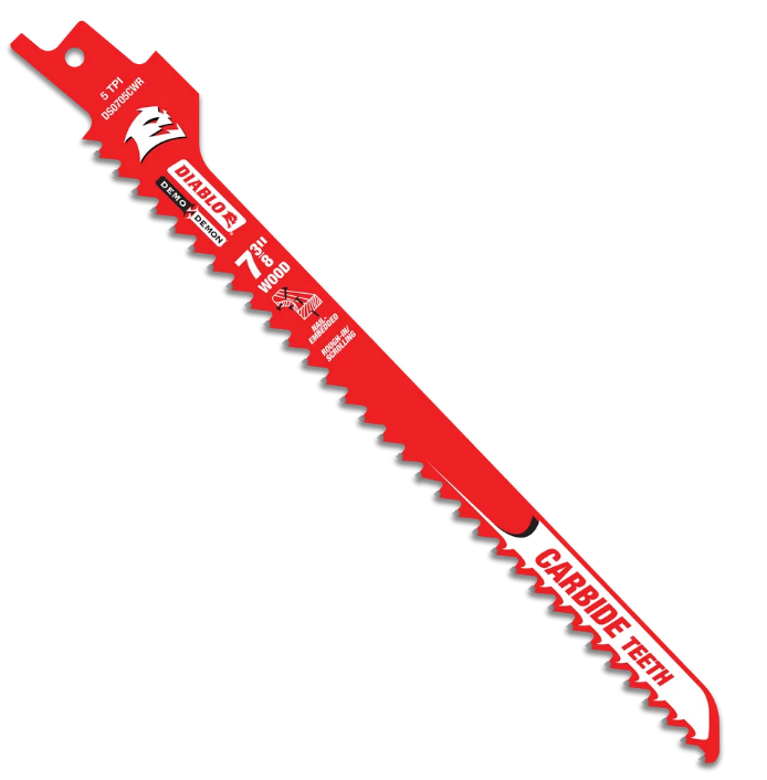 Diablo's new Demo Demon 7-3/8 inch x 5 TPI Rough-In/Scrolling Carbide reciprocating saw blades deliver an unmatched 50 times longer cutting life, faster cuts and increased productivity in scrolling and radius cutting applications. These industry first carbide blades are designed with large gullets and a strengthened blade body for fast chip removal and maximum stability in extreme cutting applications. Diablo's new optimized tip design provides fast plunge capabilities, saving time and effort when engaging material. In addition, these radical blades feature Perma-SHIELD non-stick coating to prevent gumming and friction for fast, effortless cuts in nail embedded wood and clean wood.