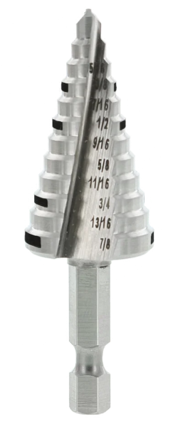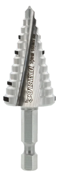 Diablo's new Step Drill Bits bring exclusive technology to the Electrician, Plumber and HVAC contractor with fast, accurate cuts and increased stability in thin metals, PVC and other plastic materials. The innovative Split Point Tip design enables a fast, on point start resulting in increased durability and up to 6X longer life. An automated precision grinding process on each step reduces wear and delivers 2X faster cuts. Multiple hole sizes are made easy with laser etched step markings while increased step heights for common hole sizes makes drilling holes more efficient and faster. Designed with a 1/4 inch hex shank, these bits are impact ready and can be used with drills and impact drivers.