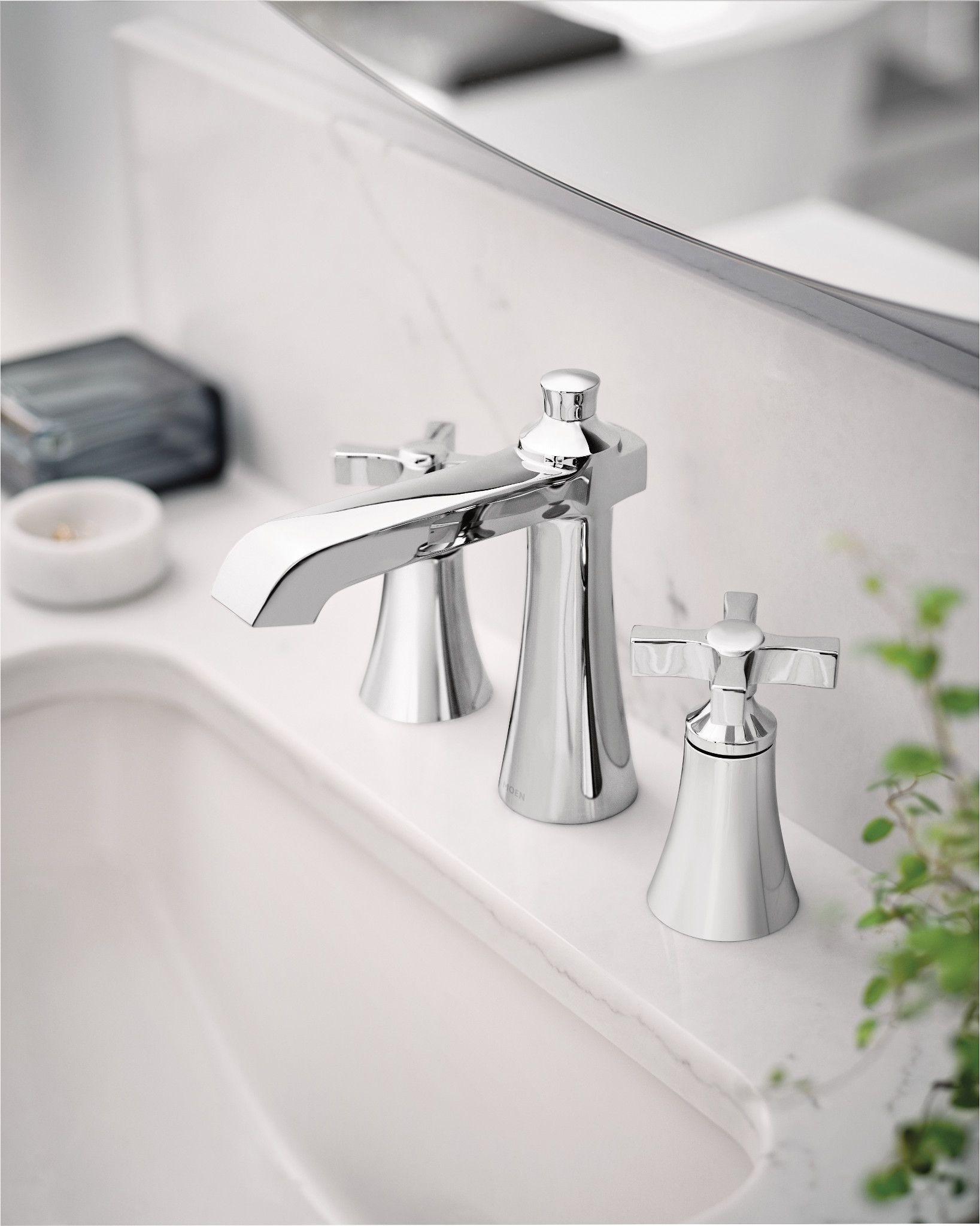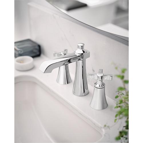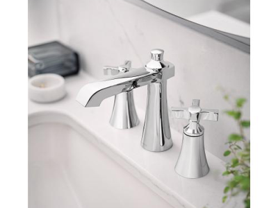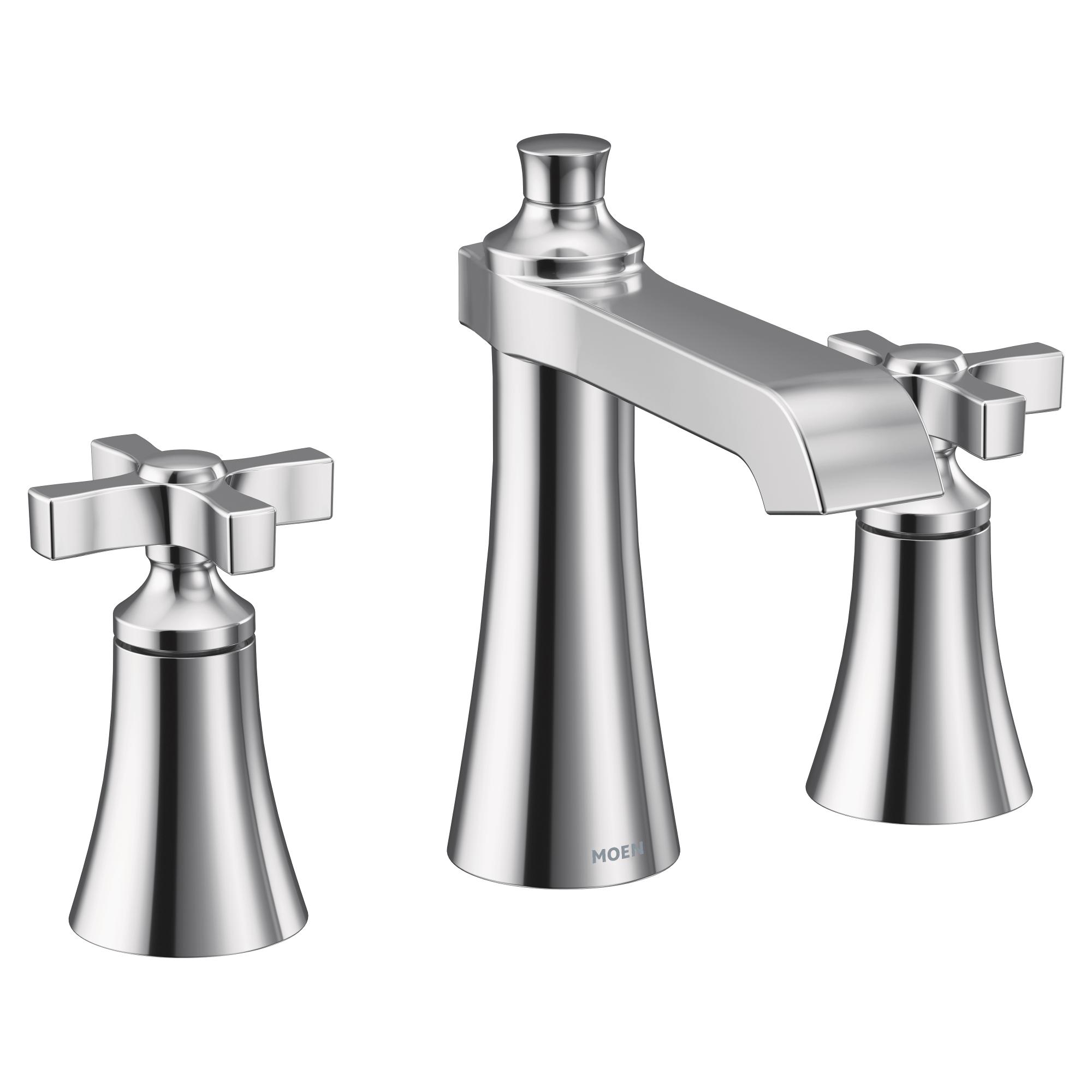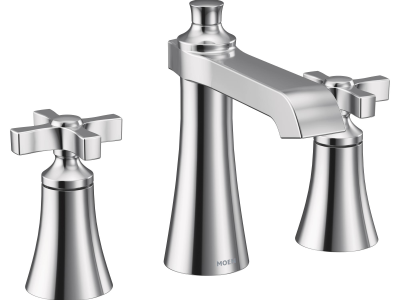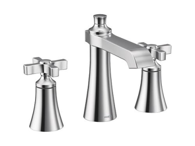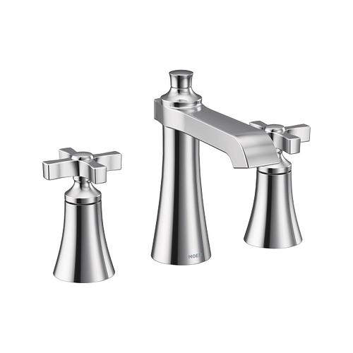 Moen®, TS6985, Bathroom Faucet, Widespread, Flara™ Collection, 1.2 gpm Flow Rate, 8 to 16 in Center Distance, High-Arc Spout, 5.8 in Spout Reach, 4-3/4 in Spout Height, Cross Handle, 2 Handles, Lift Rod Drain, 3 Faucet Holes, 1/2 in Connection, IPS Connection, Spray Pattern: Aerated Stream, 1-1/4 in Maximum Deck Thickness, Deck Mounting, 1234™ Duralast™ Cartridge, 7 in H Dimensions, Metal, Chrome, Domestic, Commercial Commercial/Residential