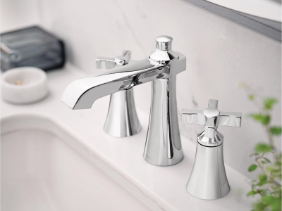 The Flara bathroom suite beautifully blends timeless classics with contemporary flair. The faucet's bold details, clean lines and expressive, gestural flared surfaces combine with slim proportions and a tall, elegant stature for a striking appearance. The Flara bathroom suite includes single-handle and two-handle faucet options, matching tub/shower fixtures, a tub-filler faucet, and a broad selection of matching accessories that provides a cohesive look throughout the bath.