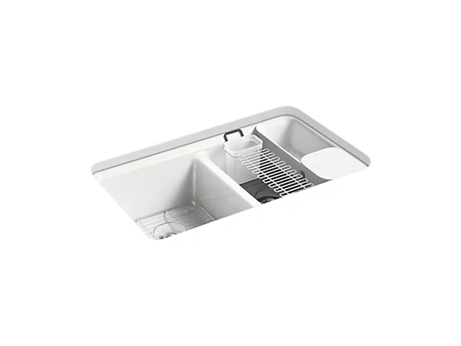 The understated beauty of this Riverby sink makes it an elegant and versatile addition to the kitchen. The two equal-sized basins feature a sloped base that minimizes water pooling. Crafted from enameled cast iron, this sink resists chipping, cracking, or burning for years of beauty and reliable performance. It comes with a custom-fit colander with integral cutting board, a utility rack with soaking cup, and a stainless-steel bottom sink rack.