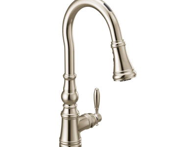 U by Moen™ Pulldown Kitchen Faucet, Weymouth™ Collection, 1.5 gpm Flow Rate, High-Arc Spout, 7.95 in Spout Reach, 9-53/16 in Spout Height, 68 in Hose, Lever Handle, 1 Handles, 1 Faucet Holes, 1-1/2 in Faucet Hole, 3/8 in Connection, Compression Connection, Spray Pattern: Boosted Rinse, Powerful Cleaning Rinse, Aerated Stream, Boosted Stream, Function: Touchless, 4 Spray Functions, 2-1/2 in Maximum Deck Thickness, Deck Mounting, 1255 Duralast® Cartridge, 31-5/8 in L x 14-1/4 in W x 4-1/4 in H, Metal, Polished Nickel, Import