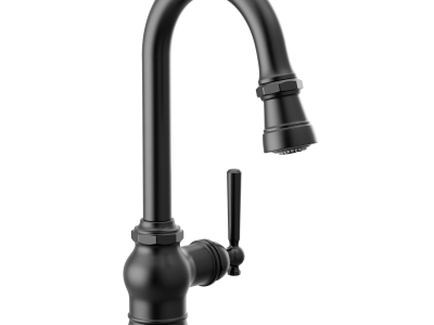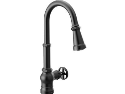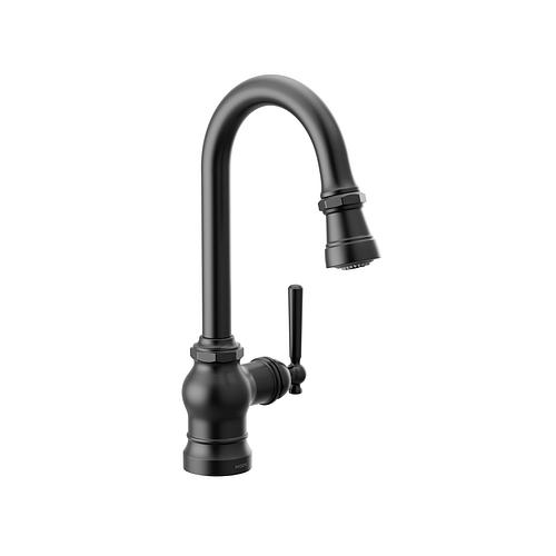 Moen®, S52003BL, Kitchen Faucet, Series: S52003, Paterson™ Collection, 1.5 gpm Flow Rate, High-Arc Spout, 7-5/8 in Spout Reach, 8-5/16 in Spout Height, 68 in Hose, Lever Handle, 1 Handles, 1 Faucet Holes, 1-1/2 in Faucet Hole, 3/8 in Connection, Compression Connection, Spray Pattern: Aerated Stream, 2 Spray Functions, 1255 Duralast™, 15-9/16 in H Dimensions, Metal, Matte Black, Domestic