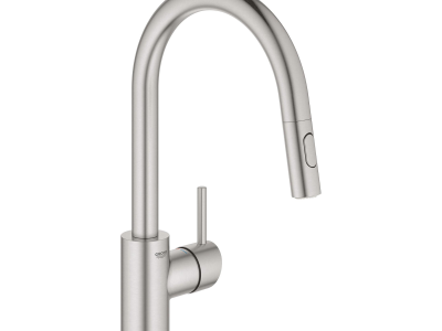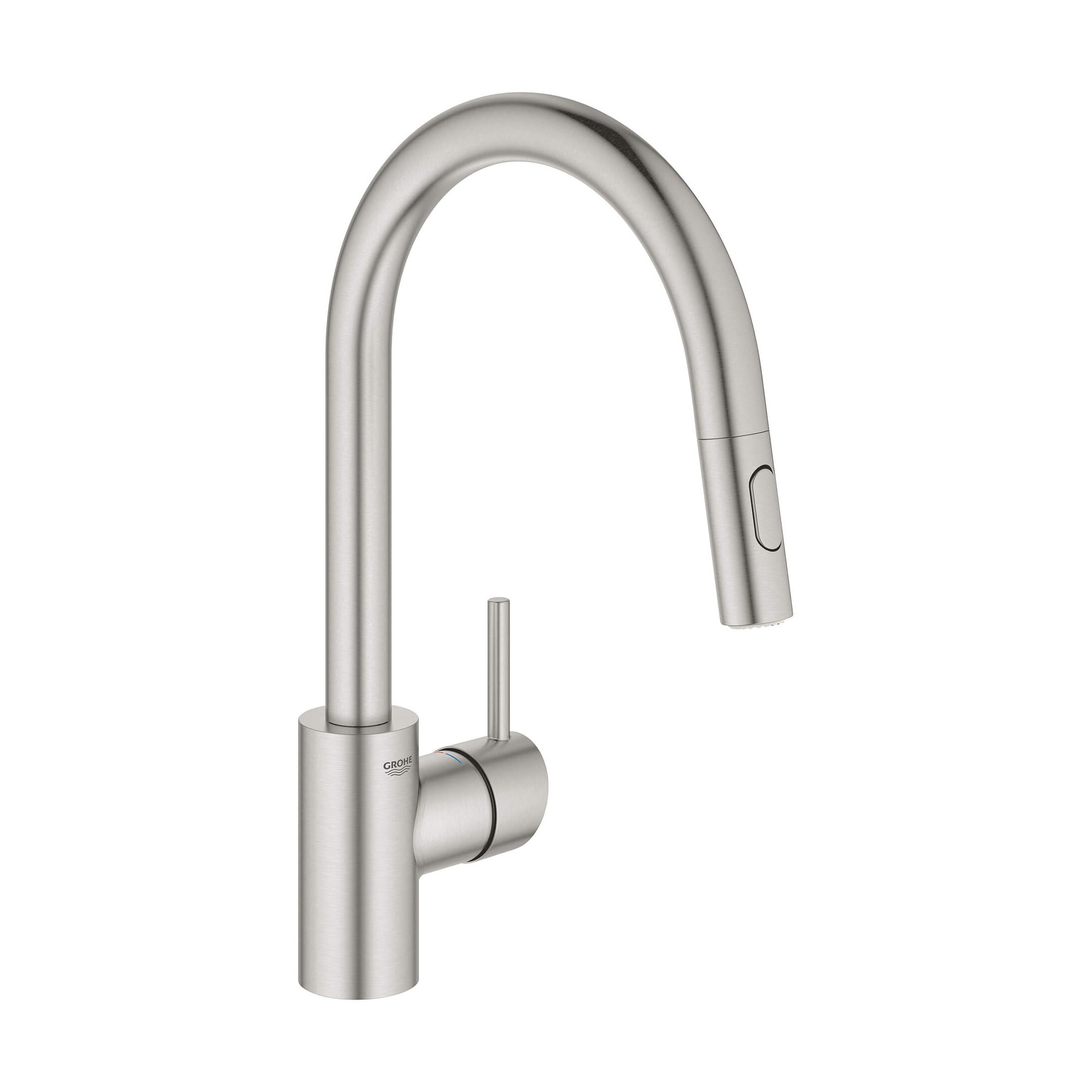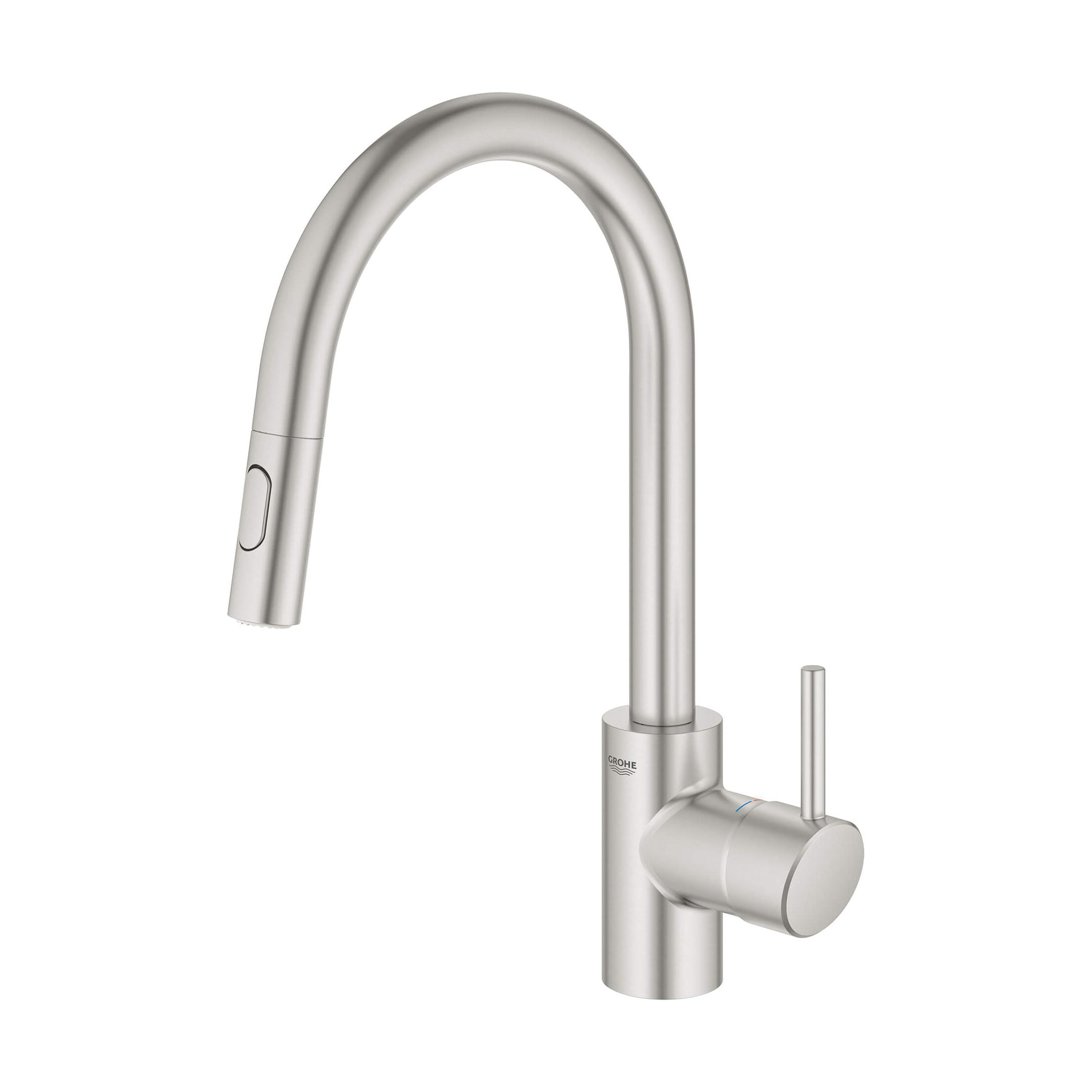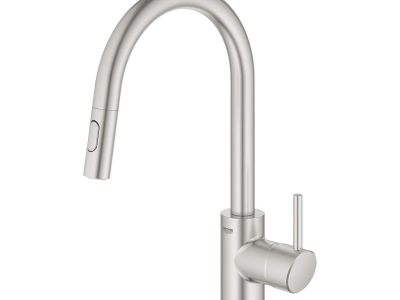 The GROHE Concetto™ dual spray pull-out kitchen faucet is sleek, sophisticated and engineered for superior performance. Convenient pull-out spray easily toggles between regular water flow and spray for maximum versatility for every kitchen task. Meticulously crafted with a high, swivel spout for ease when filling pots and lever handle that offers precise control of water pressure and temperature. Available in durable GROHE StarLight® finishes for lasting beauty.