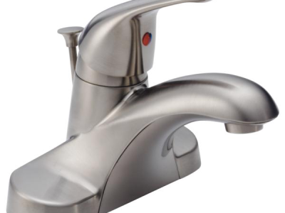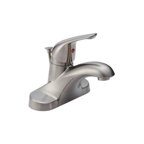 DELTA®, B510LF-SS, Bathroom Faucet, Foundations® Collection, 1.5 gpm Flow Rate, 4 in Center Distance, Rigid Spout, 4-1/4 in Spout Reach, 2-5/8 in Spout Height, Lever Handle, 1 Handles, Pop-Up Drain, 3 Faucet Holes, 1/2-14 Connection, NPSM Connection, 1-1/4 in Maximum Deck Thickness, Deck Mounting, Washerless Ball, 6-1/8 in W x 7-1/8 in H Dimensions, Solid Brass, Stainless Steel, Import, Commercial Commercial/Residential
