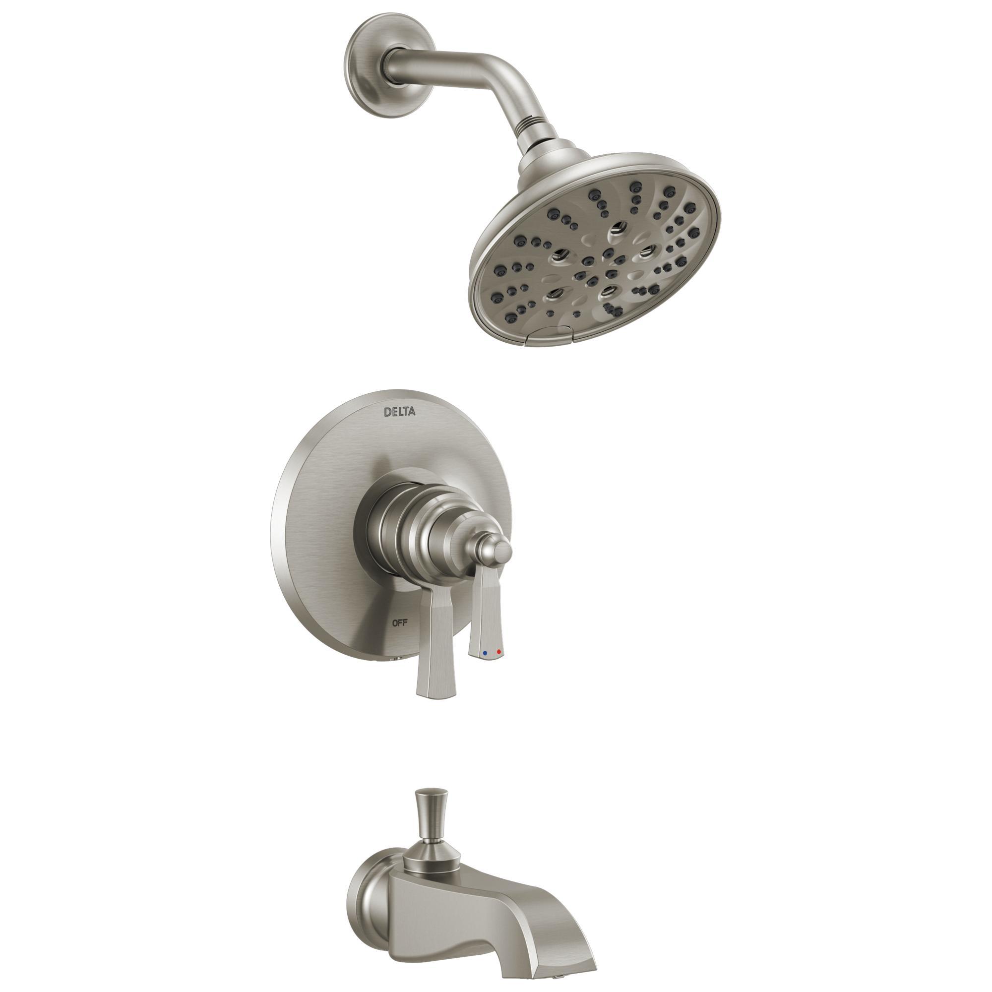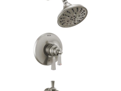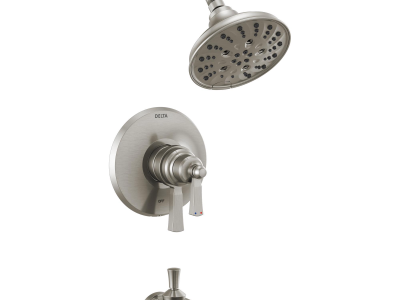 The Dorval™ Bathroom Collection diverges from conventional expectations with regal accents and a powerful design that commands your attention. Inspired by the feminine lines of French architecture and the regal stature of German castles, the Dorval™ Bath Collection balances grace and power in this modern take on new traditional design. DELTA® H2Okinetic® Showers look different because they are different. Using advanced technology, H2Okinetic® showers sculpt water into a unique wave pattern, giving you 3X the coverage of a standard shower head. The end result is a shower that provides more coverage, more warmth and more intensity for a truly drenching shower experience. With separate handles for volume and temperature control, this DELTA® tub/shower provides a more refined showering experience. Simply set the water at your preferred temperature and turn the shower on or off with the volume control handle - without interrupting your set temperature. The pause setting gives you ample space for shaving, lathering and other shower tasks, then easily restarts the water with the temperature where you left off. This spray setting helps you conserve water, so you can worry less about depleting your supply of hot water - and you help the environment too. DELTA® pressure-balance valves use Monitor® Technology to protect you and your family from sudden temperature changes. DELTA® WaterSense® labeled faucets, showers and toilets use at least 20% less water than the industry standard-saving you money without compromising performance.
