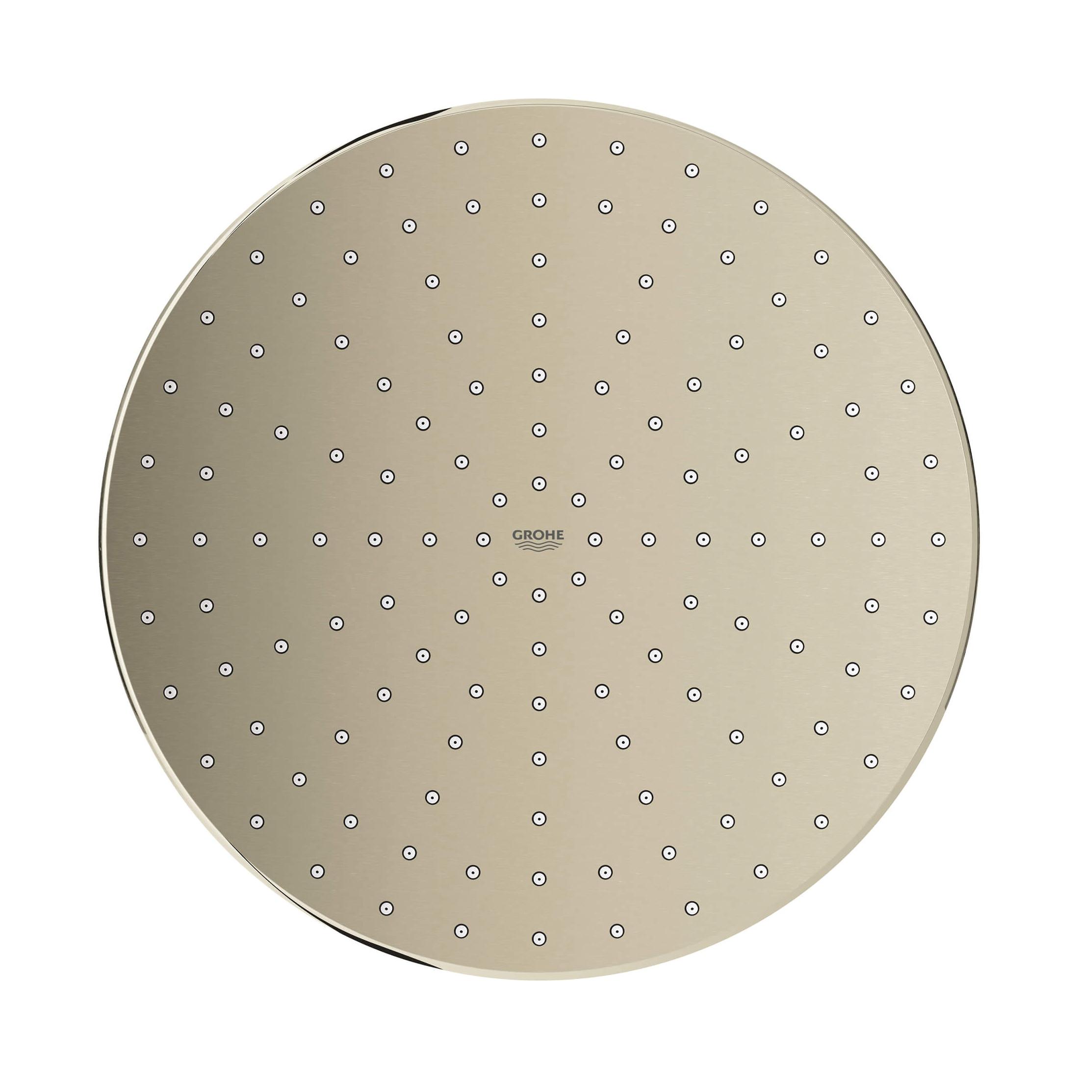 GROHE Shower Head, Single Function, Series: 26569_0, Rainshower™ Mono 310 Collection, 1.75 gpm Flow Rate, 1/2 in Connection, Round Shape, 1 Spray, Spray Pattern: Full/Rain, 2-1/8 in H Head, 7-3/4 in Overall Length, 12-3/16 in Overall Width, 12-3/16 in Overall Height, Plastic, Brushed Nickel, Import