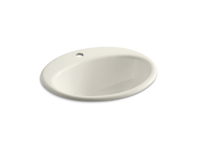 Kohler® Self-Rimming Bathroom Sink, Farmington®, Oval, 16 in L x 11 in W Bowl, 1-11/16 in Drain Opening, 1 Faucet Holes, 1 Basin, 19-1/4 in W x 16-1/4 in D x 8-3/4 in H, Drop-In Mount, Enameled Cast Iron, Biscuit, ADA Compliance (Yes/No): Yes