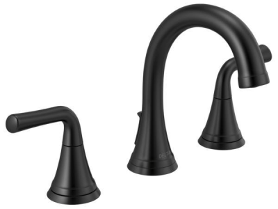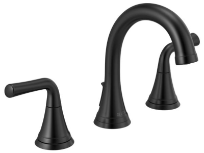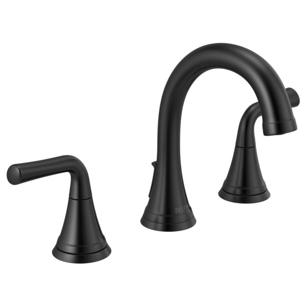 DELTA® Widespread Bathroom Faucet, Lead Free, Kayra™ Collection, 1.2 gpm at 60 psi Flow Rate, 6 to 16 in Center Distance, Rigid Spout, 5 in Spout Reach, 4-7/16 in Spout Height, Lever Handle, 2 Handles, Metal Push Pop-Up Drain, 3 Faucet Holes, 3/8 in Connection, Compression Connection, Spray Pattern: Laminar, 1 Spray Functions, 1-5/8 in Maximum Deck Thickness, Deck Mounting, Washerless Cartridge, 6-15/16 in H Dimensions, Brass, Matte Black, Import