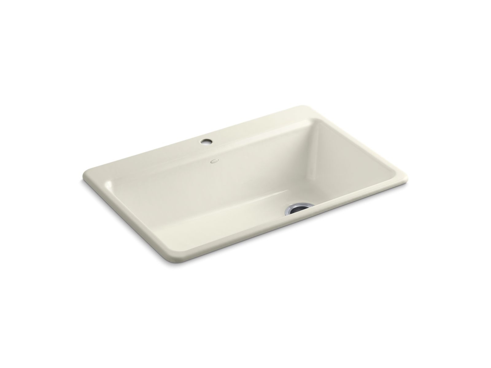 Kohler®, 5871-1A2-96, Kitchen Sink With Accessories, Riverby® Collection, Rectangular Shape, 30-1/4 in Bowl Length, 15-13/16 in Bowl Width, 9 in Bowl Depth, 3-7/8 in Drain Opening, 1 Faucet Holes, 1 Bowls, 33 in L x 22 in W x 9-5/8 in H Overall, Top Mounting, Enameled Cast Iron, Biscuit
