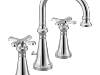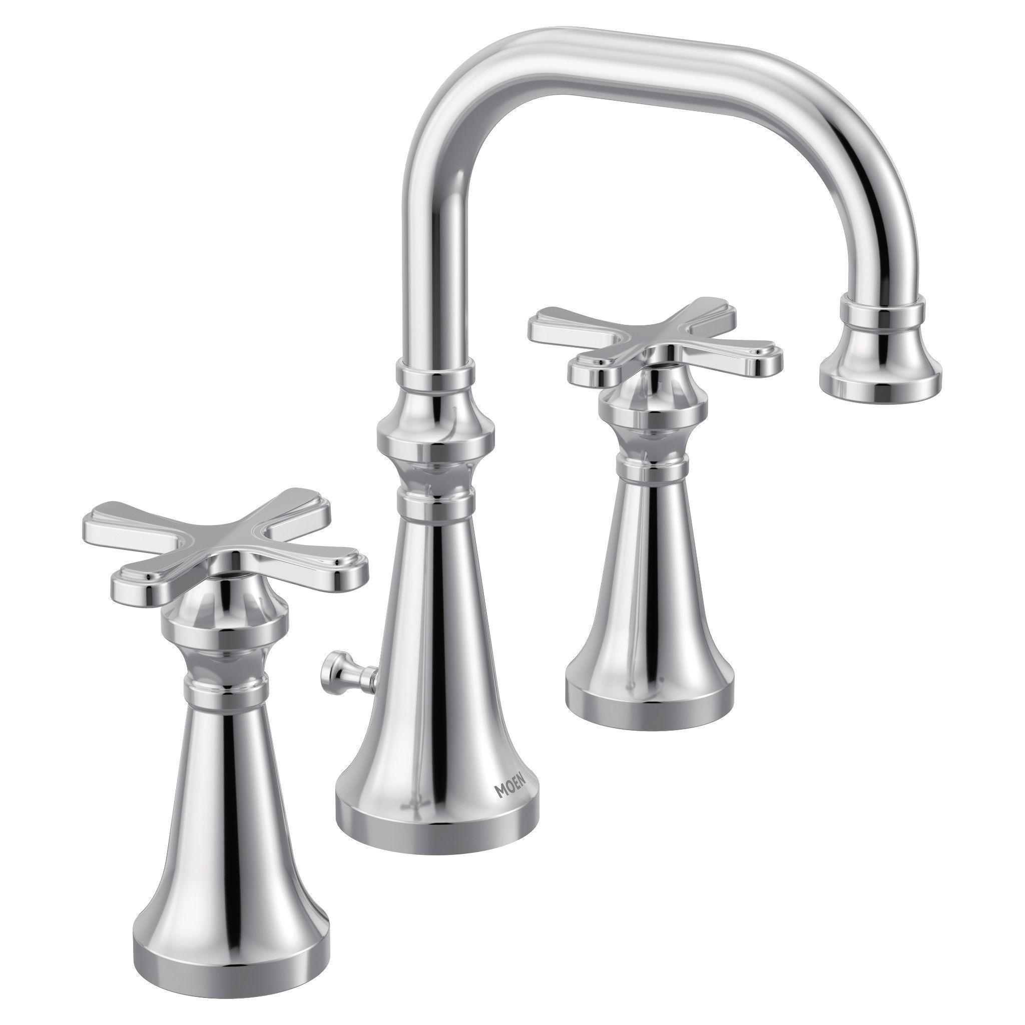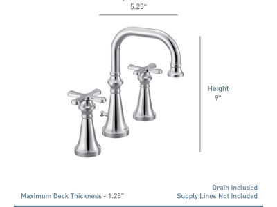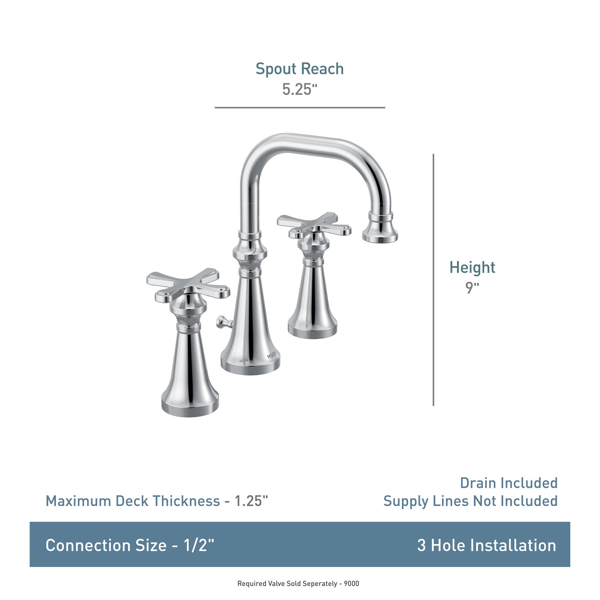 Moen® Widespread Lavatory Faucet, Colinet™ Collection, 1.2 gpm Flow Rate, 8 in Center Distance, 90 deg Rotation Spout, 5.24 in Spout Reach, 5-11/16 in Spout Height, Cross Handle, 2 Handles, Lift Rod Drain, 3 Faucet Holes, 1/2 in Connection, IPS Connection, Spray Pattern: Aerated Flow, 1-1/4 in Maximum Deck Thickness, Deck Mounting, 1234 Duralast™ Cartridge, Metal, Polished Chrome, Domestic, Residential