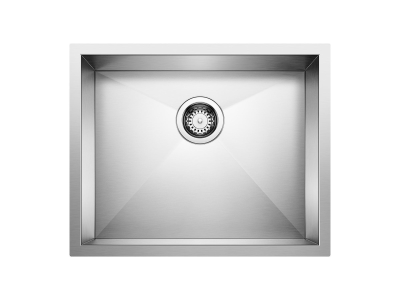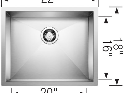 Blanco, 443050, Sink, Small Single, Series: QUATRUS R0, Rectangle Shape, 20 in Bowl Width, 16 in Bowl Depth, 3-1/2 in Drain Opening, 1 Bowls, 9 in H x 21-15/16 in W x 17-15/16 in D Overall, Undermount Mounting, Stainless Steel, Brushed, Import