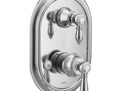 Moen® M-Pact™ Transfer Valve Trim, Series: UTS4311 Series, Weymouth™ Collection, 2 Handles, Lever Handle, 7-1/4 in W x 10-1/8 in H Trim, 1213 Ceramic Disk Volume Control Cartridge, Wall Mounting, For Use With: U232/U362 Series Valves, Metal, Polished Chrome, Domestic, Residential