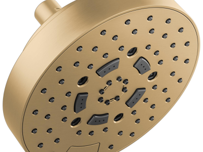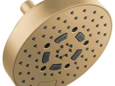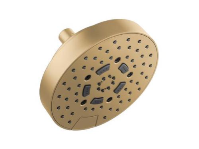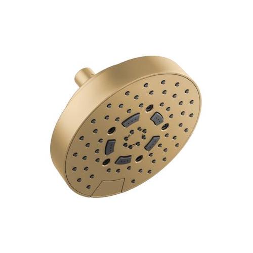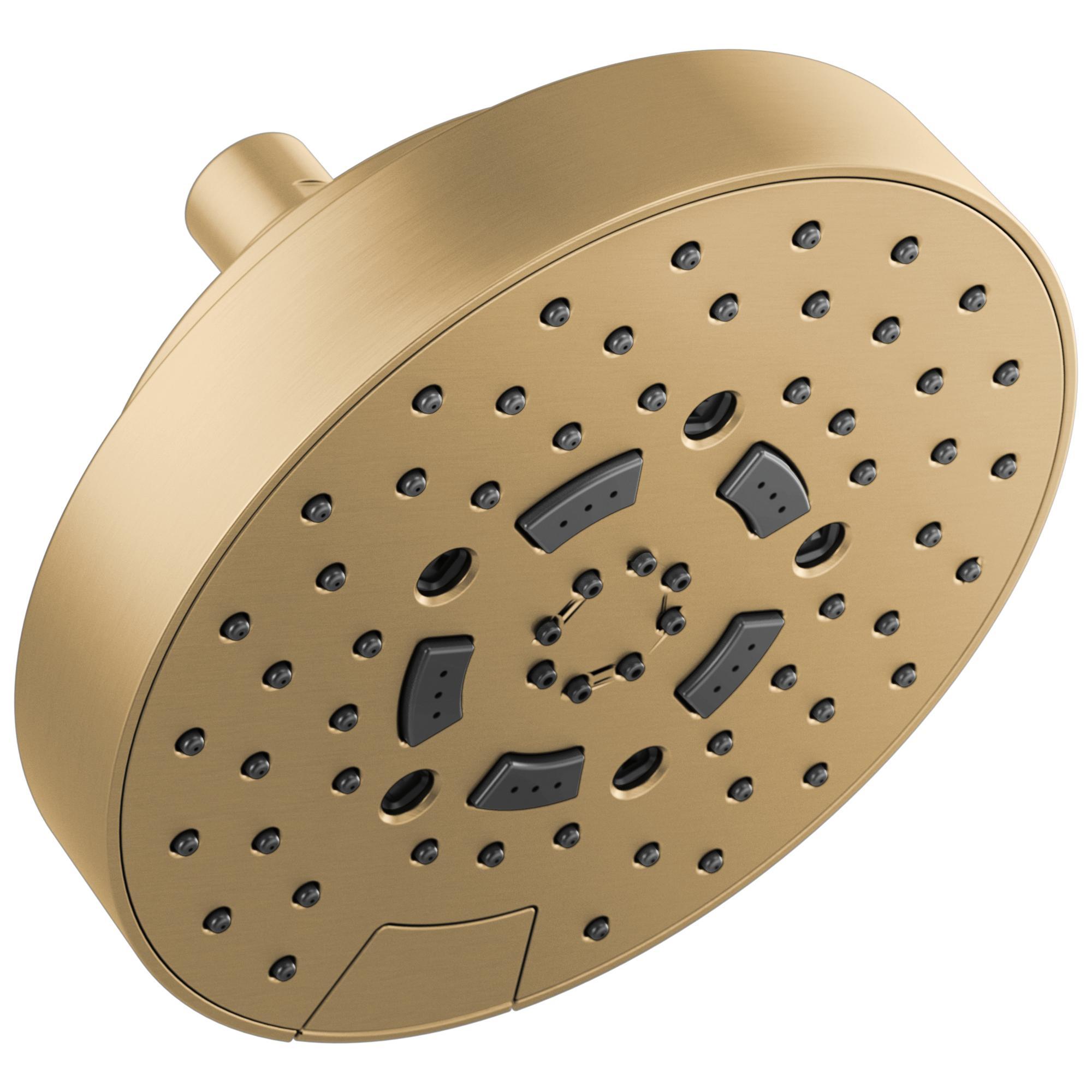 Brizo® Showerhead, Linear Multi-Function Universal, ESSENTIAL™ Collection, 2.5 gpm Maximum, 1/2-14 NPSM Connection, Round Shape, 5 Sprays, Spray Pattern: H2Okinetic® Rinsing/Shampoo/Full/Full+Shampoo/Massage, Wall Mounting, 80 psi Pressure, 7 in Dia x 4-1/2 in H Head, 7 in Overall Length, 7 in Overall Width, 4.5 in Overall Height, Plastic, Luxe Gold, Import
