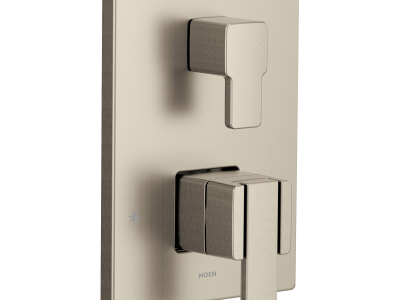 Moen® M-Pact™ Transfer Valve Trim, Series: UTS9011 Series, 90 Degree™ Collection, 2 Handles, Lever Handle, 6 in W x 8-5/8 in H Trim, 1213 Ceramic Disk Volume Control Cartridge, Wall Mounting, For Use With: U232/U362 Series Valves, Metal, Brushed Nickel, Domestic, Residential