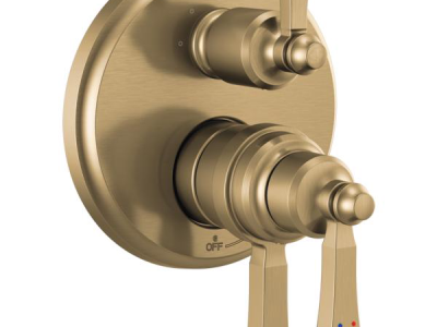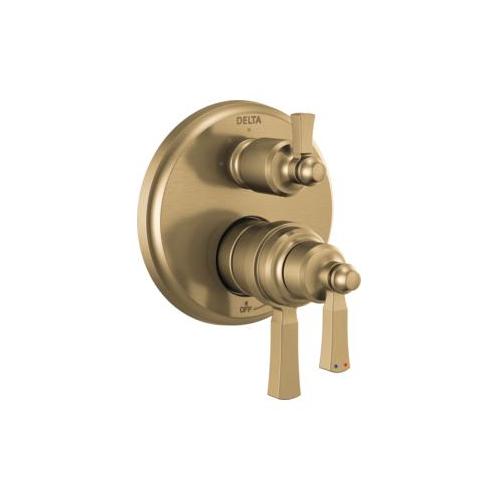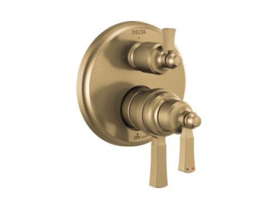 DELTA® Valve Trim; Traditional; Series: Monitor® 17T; Dorval™; Valve Flow Rate 7.2 gpm; 2 Handles; Lever; 5.63 in L x 6.75 in W x 8.5 in H Trim; Thermostatic Cartridge Valve/Cartridge; Hand Shower Yes/No: No; 60 psi; Wall Mount; For Use with: MultiChoice® R22000 Series Universal Integrated Shower Diverter Rough Valve; Brilliance® Champagne Bronze; Domestic; Commercial/Residential