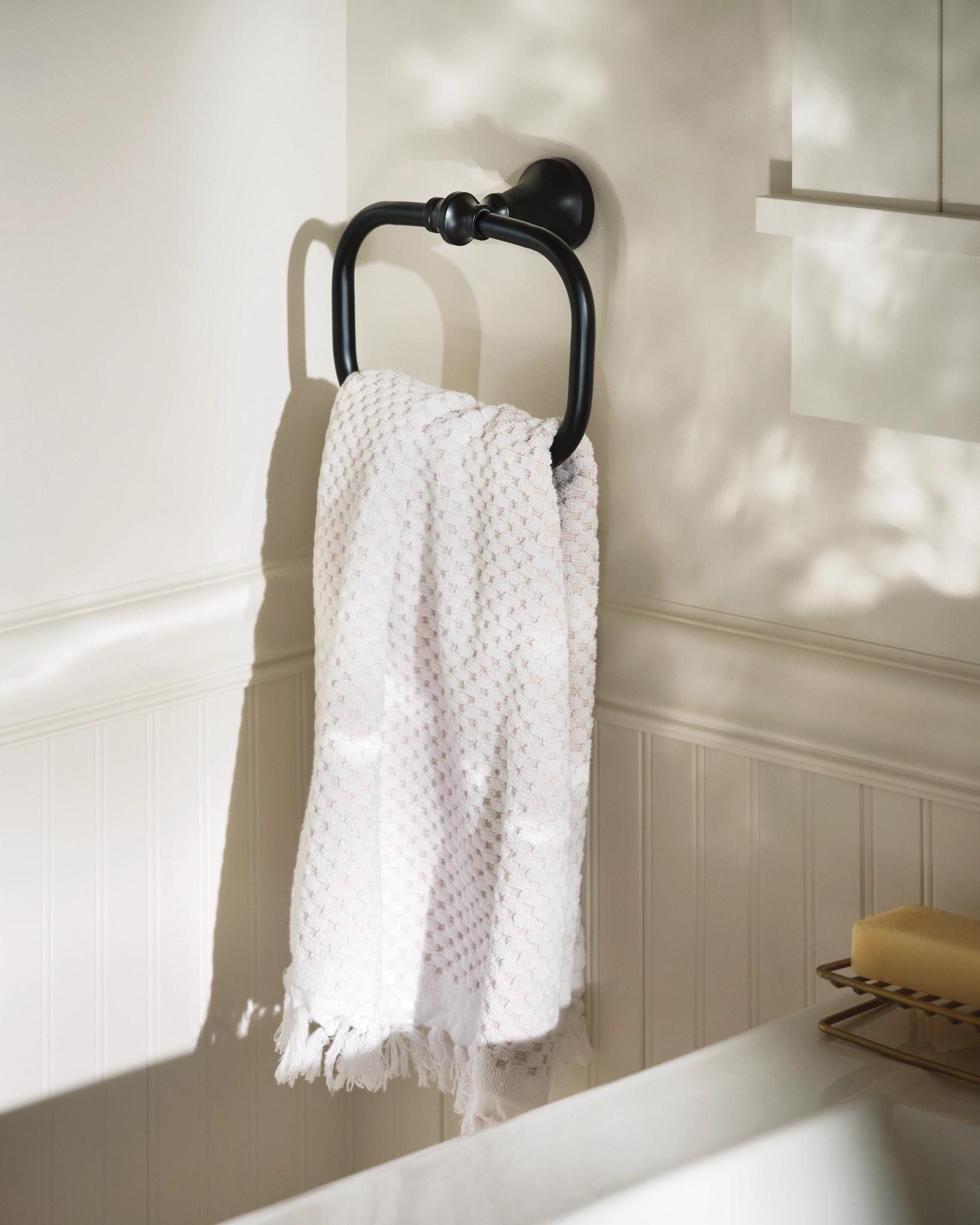 Moen® Towel Ring, Colinet™ Collection, 7-1/2 in Overall Length, 3-5/8 in Overall Depth, 5-3/4 in Overall Height, Ceramic/Solid Brass/Zinc, Matte Black, Import