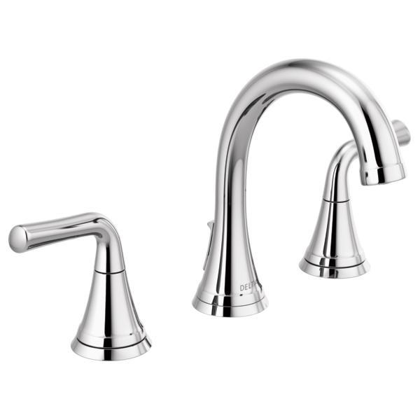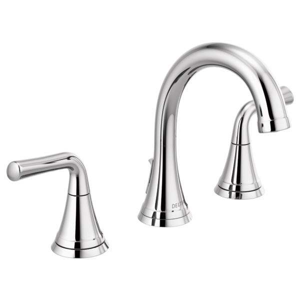 DELTA® Widespread Bathroom Faucet, Lead Free, Kayra™ Collection, 1.2 gpm at 60 psi Flow Rate, 6 to 16 in Center Distance, Rigid Spout, 5 in Spout Reach, 4-7/16 in Spout Height, Lever Handle, 2 Handles, Metal Push Pop-Up Drain, 3 Faucet Holes, 3/8 in Connection, Compression Connection, Spray Pattern: Laminar, 1 Spray Functions, 1-5/8 in Maximum Deck Thickness, Deck Mounting, Washerless Cartridge, 6-15/16 in H Dimensions, Brass, Polished Chrome, Import