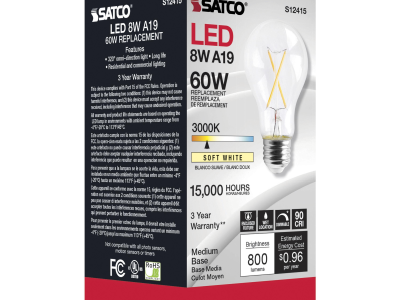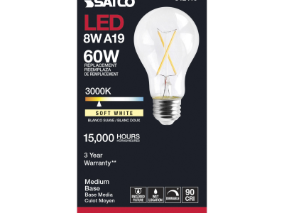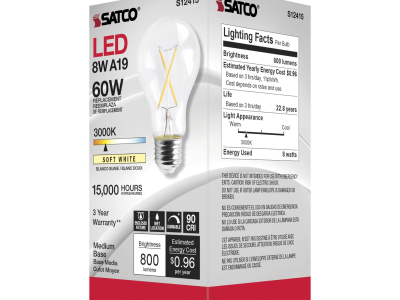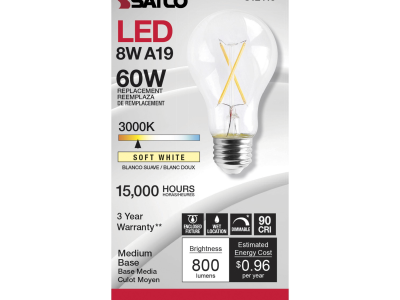 The most common, useful lamps on the market are now suitable for use nationwide with their 90 CRI T20 CEC rating. Our LED A15 and A19 LED filament lamps incorporate all the latest LED technologies for superior lumen output, efficiency and long life wherever they're used!|Satco's S12415 8-watt A19 lamp is a sleek lighting solution for the home. The clear, dimmable bulb is perfect for living rooms, dining rooms, and office spaces. This energy efficient lighting solution delivers 15,000 hours of soft white light.