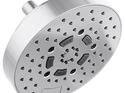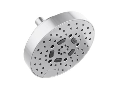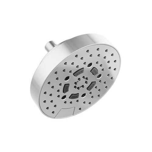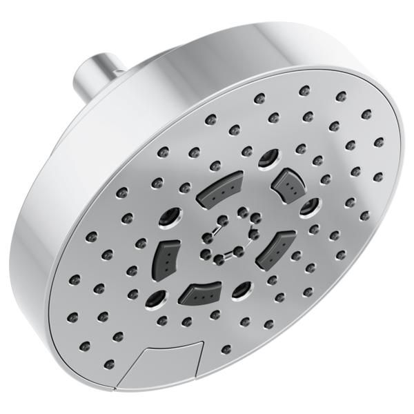 Brizo® Showerhead, Linear Multi-Function Universal, ESSENTIAL™ Collection, 2.5 gpm Maximum, 1/2-14 NPSM Connection, Round Shape, 5 Sprays, Spray Pattern: H2Okinetic® Rinsing/Shampoo/Full/Full+Shampoo/Massage, Wall Mounting, 80 psi Pressure, 7 in Dia x 4-1/2 in H Head, 7 in Overall Length, 7 in Overall Width, 4.5 in Overall Height, Plastic, Polished Chrome, Import