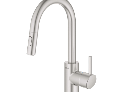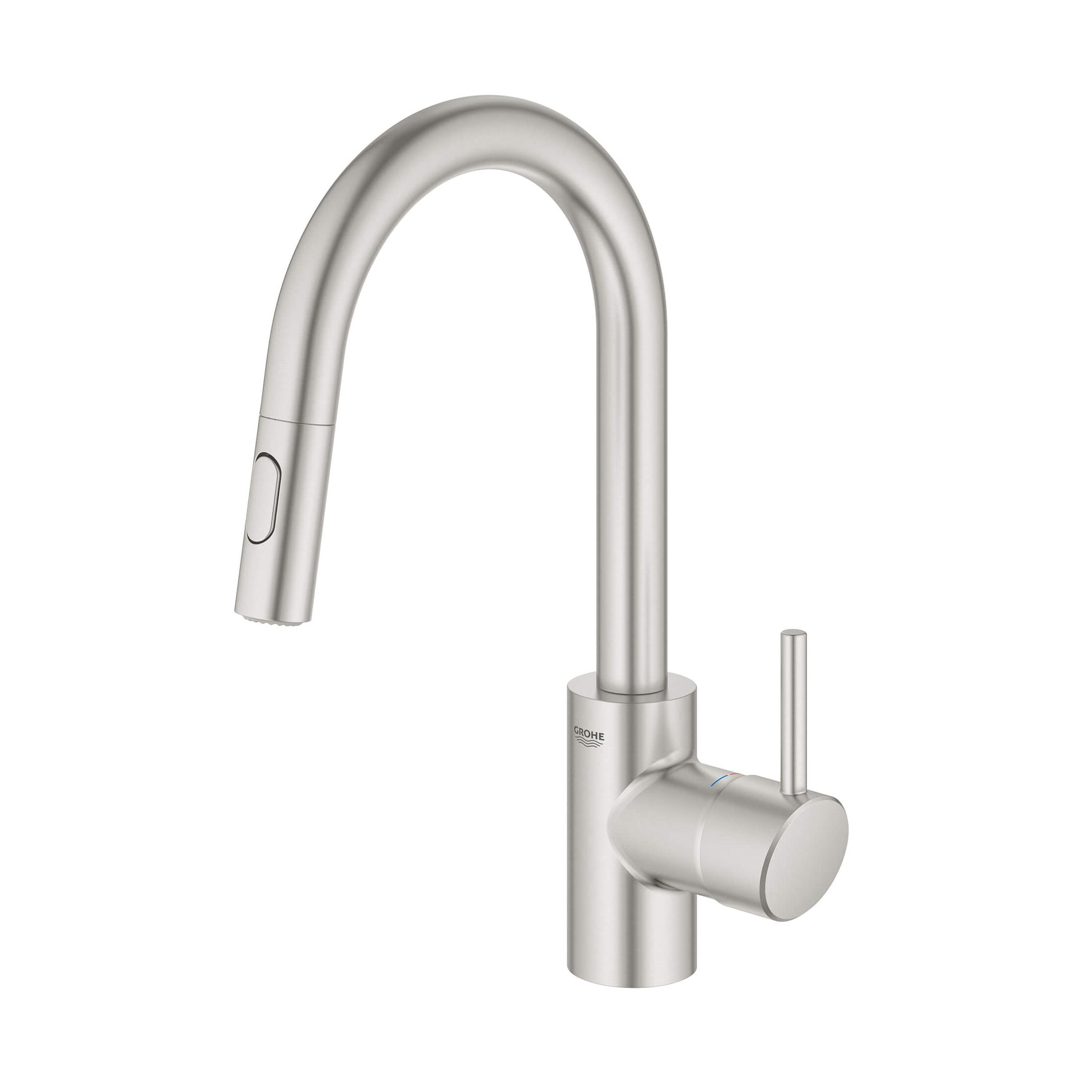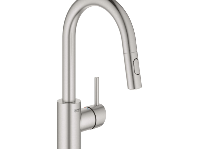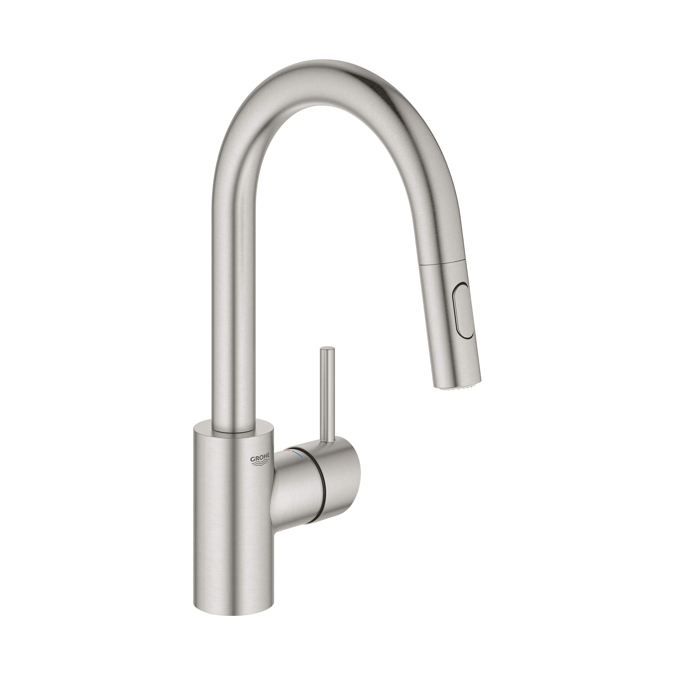 The GROHE Concetto™ dual spray pull-out kitchen faucet is sleek, sophisticated and engineered for superior performance. Convenient pull-out spray easily toggles between regular water flow and spray for maximum versatility for every kitchen task. Meticulously crafted with a high, swivel spout for ease when filling pots and lever handle that offers precise control of water pressure and temperature. Available in durable GROHE StarLight® finishes for lasting beauty.