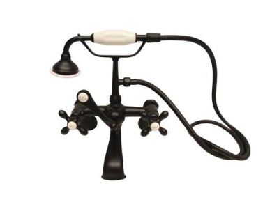 This stylish tub wall-mounted faucet has a telephone style hand held shower, a wide elephant spout and decorative metal cross handles.