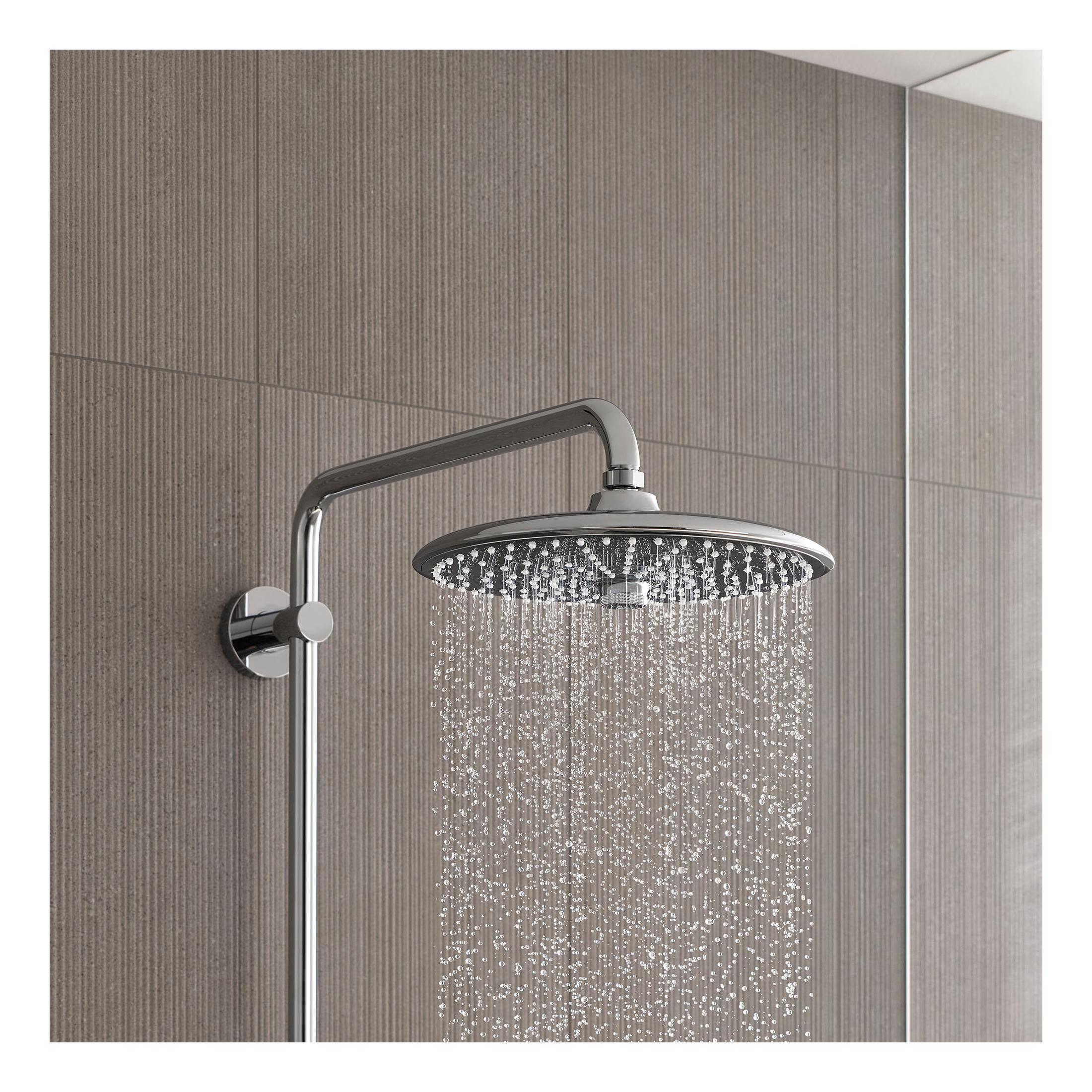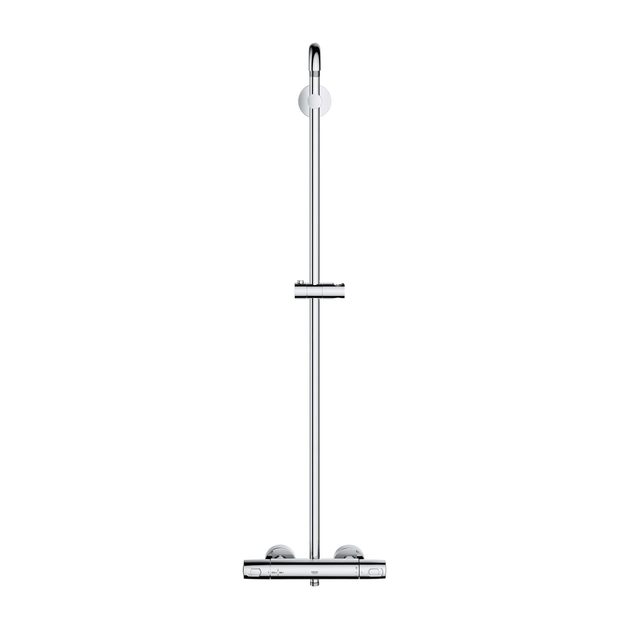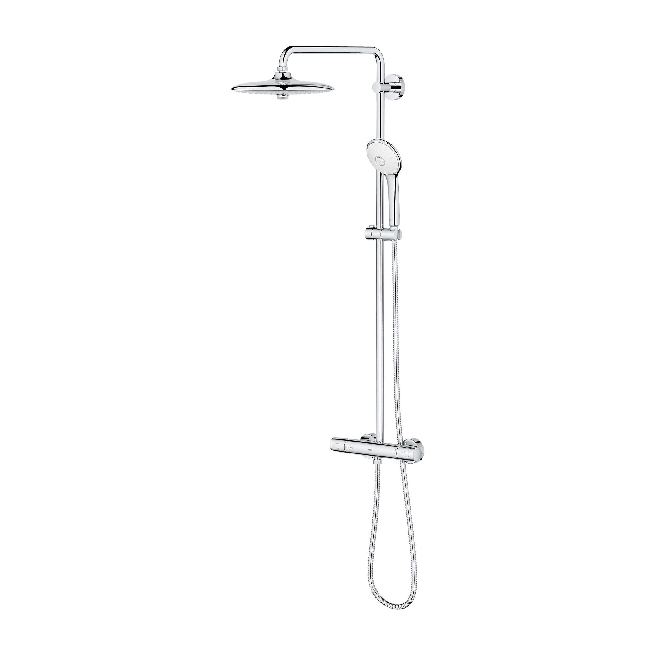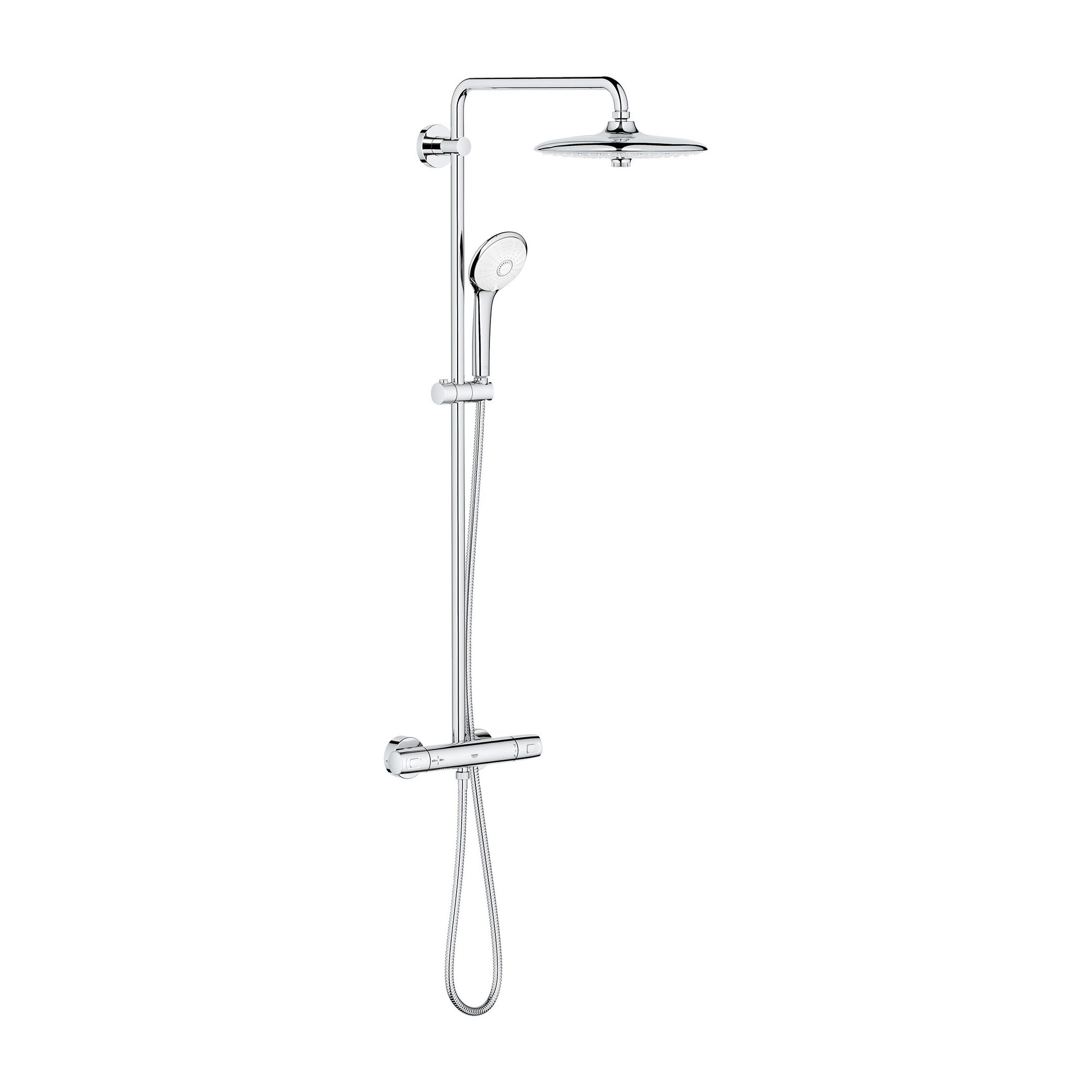 GROHE Thermostatic Shower System, Euphoria®, 10-1/4 in Shower Head Dia, Shower Arm Length: 17-3/4 in, Shower Head Patterns: 3-Function, 1.75 gpm, Jet/Rain Spray, Wall Mount, Metal, StarLight® Polished Chrome, 43-15/16 in H