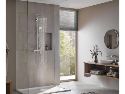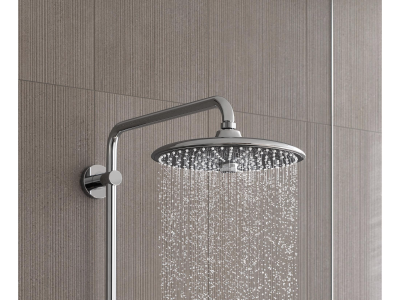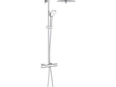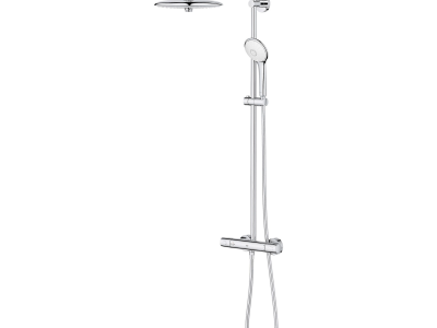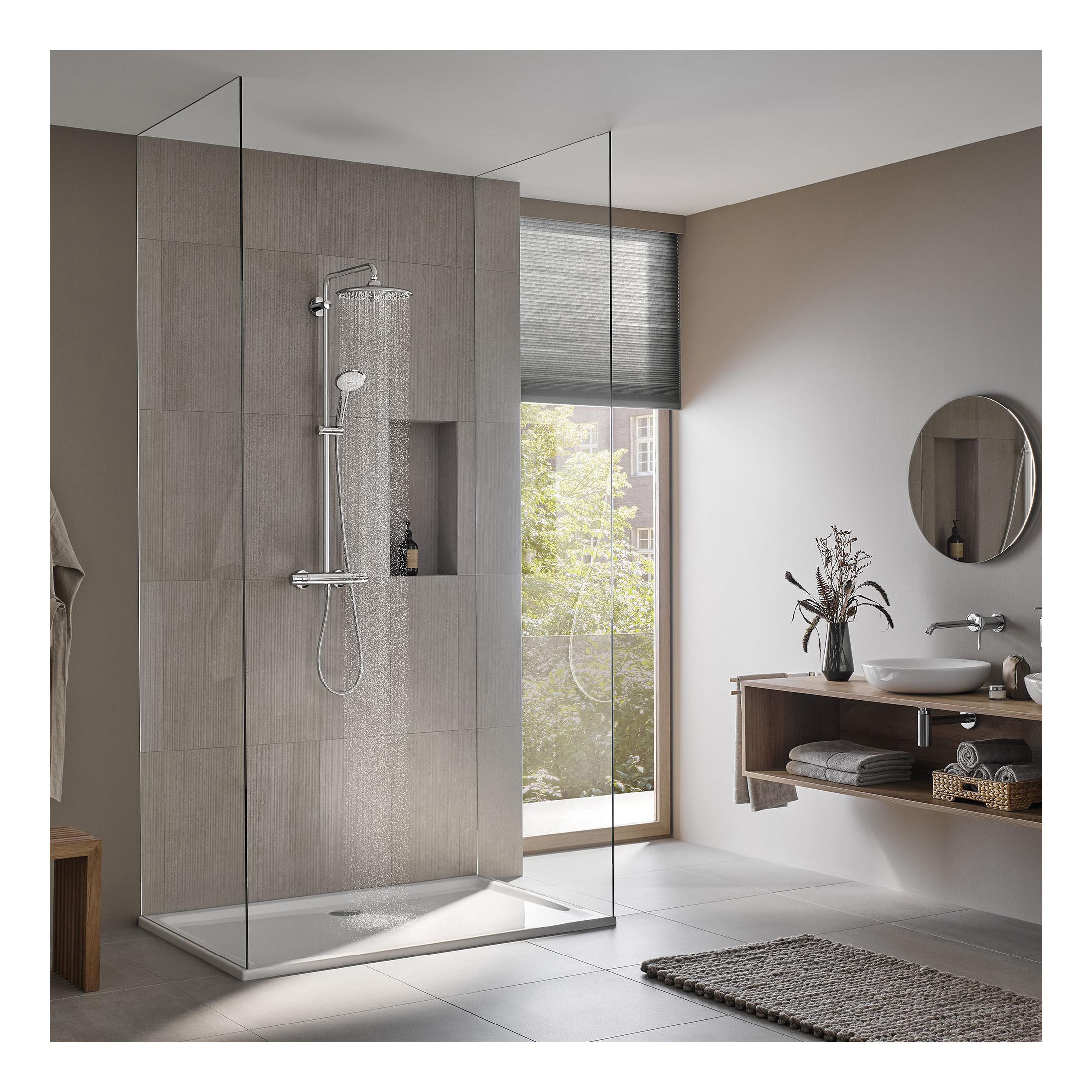 The GROHE Euphoria® 260 CoolTouch® Thermostatic Shower System offers a superior showering experience while providing unmatched protection from scalding. GROHE CoolTouch® technology ensures the thermostat body will never get too hot to touch, no matter how hot you like your shower. Sleek and contemporary, this German-engineered system was conceived to manage water for maximum enjoyment and safety featuring the popular GROHE TurboStat® that consistently maintains your desired water temperature. Even when fluctuations in water pressure occur, you'll never experience a sudden icy blast or scalding heat. The large 10 in Euphoria® 260 Shower head features a center dial to switch between 3 sprays - invigorating Jet, soothing Rain and luxurious SmartRain. Ergonomic hand shower satisfies every showering need with 3 indulgent sprays - soothing Rain, relaxing massage and luxurious, water-conserving SmartRain. Built-in diverter makes alternating between shower head and hand shower easy and enjoyable. For those who relish the shower ritual, the Euphoria® 260 CoolTouch® Thermostatic Shower System exceeds expectations.
