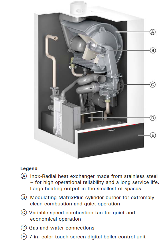 14,000 BTU input to 199,000 BTU input - 13,000 BTU heating capacity to 187,000 BTU heating capacity - Can be used with natural or LP gas without a conversion kit - 2.50 gallons water content - Inox-Radial stainless steel heat exchanger - MatrixPlus stainless steel cylinder burner - 7 inch color touch screen boiler control display - Multi-function outdoor reset boiler and system control - Variable speed circulator - All pipe and electrical connections are on the bottom - Serviceable components are accessible from the front - Built in automatic frost protection - Horizontal or vertical sealed combustion, hybrid sealed combustion double pipe vent systems, or single wall venting - 3/4 inch condensate drain connection