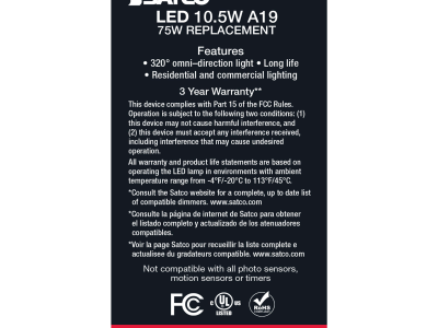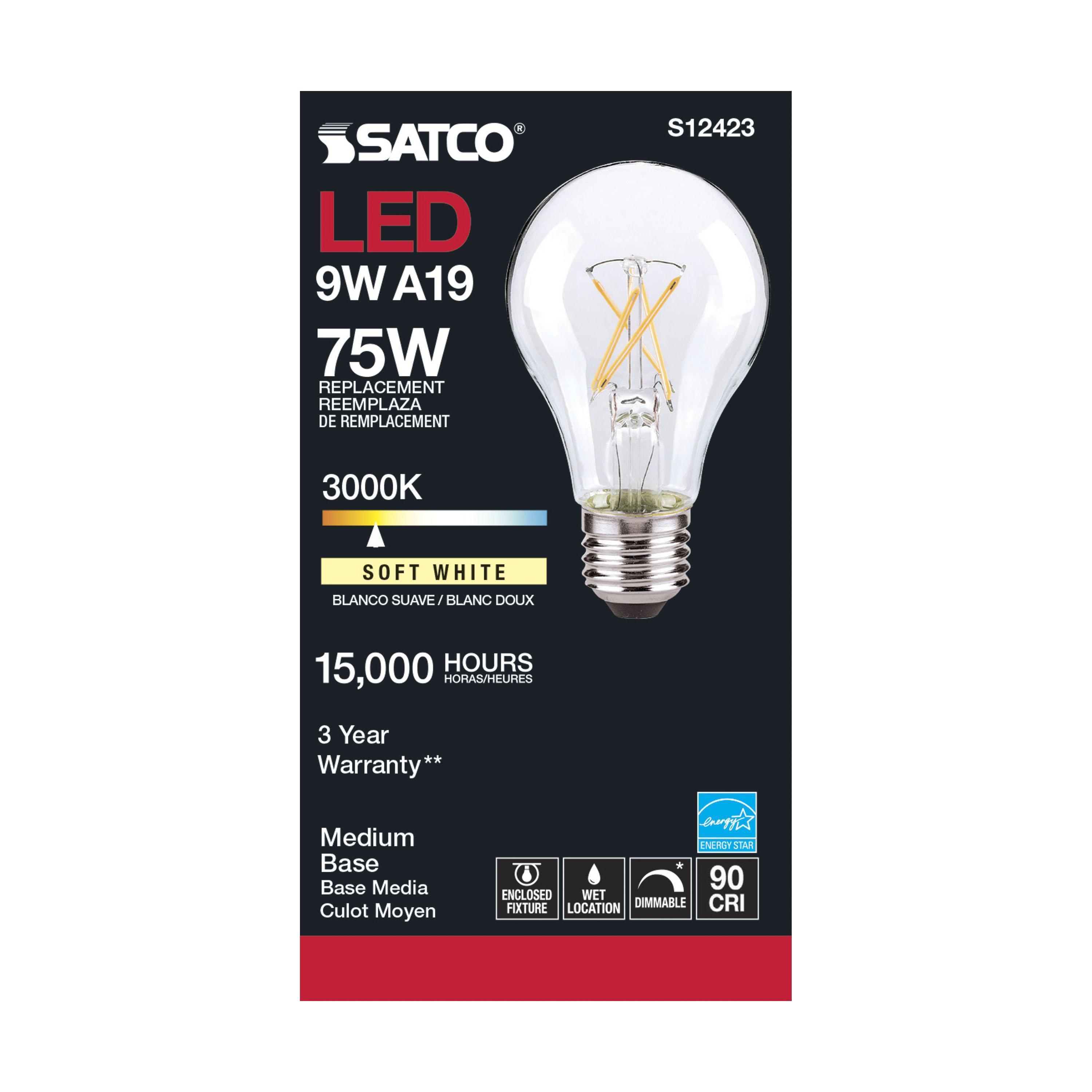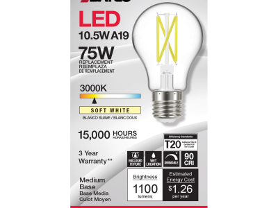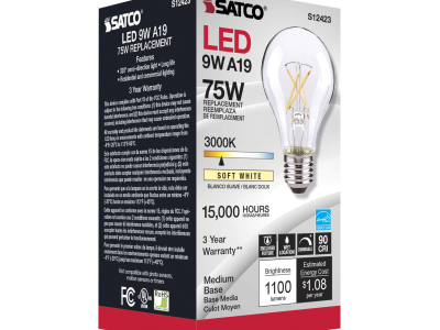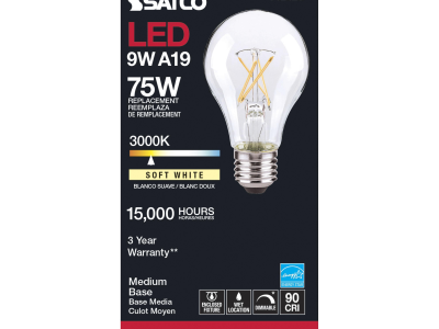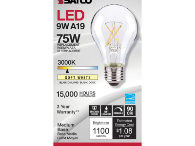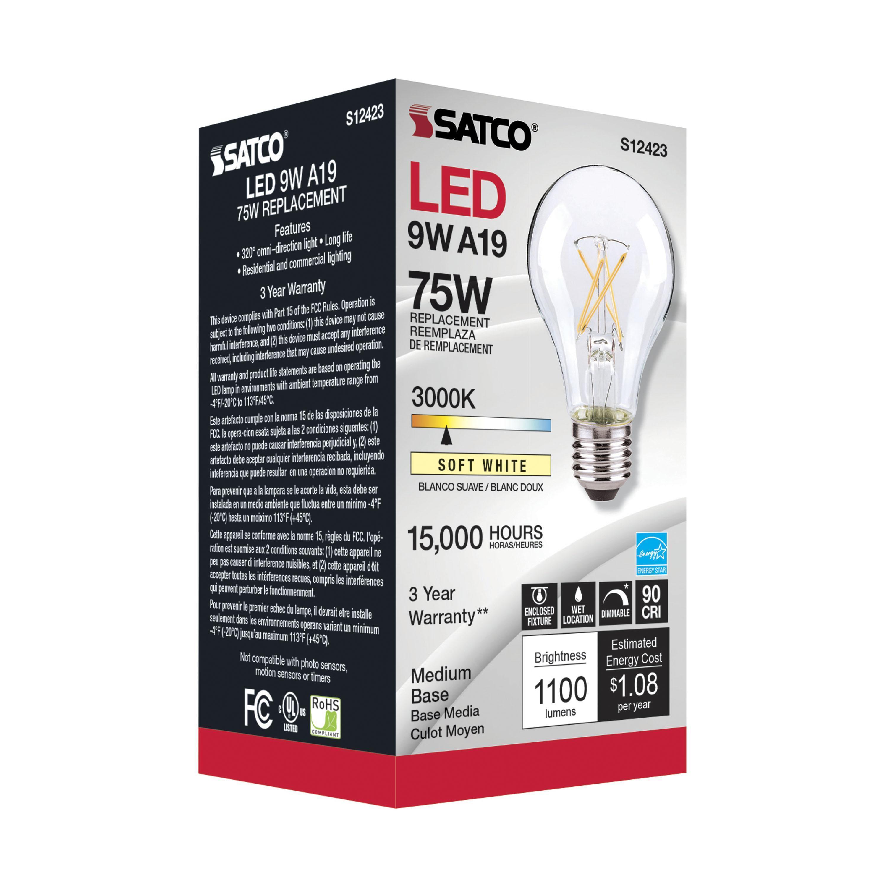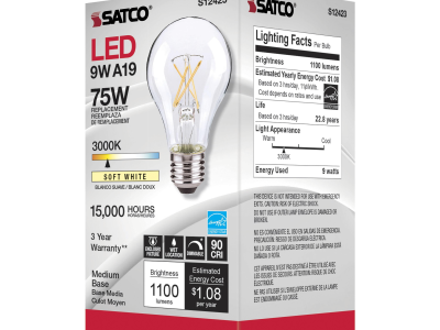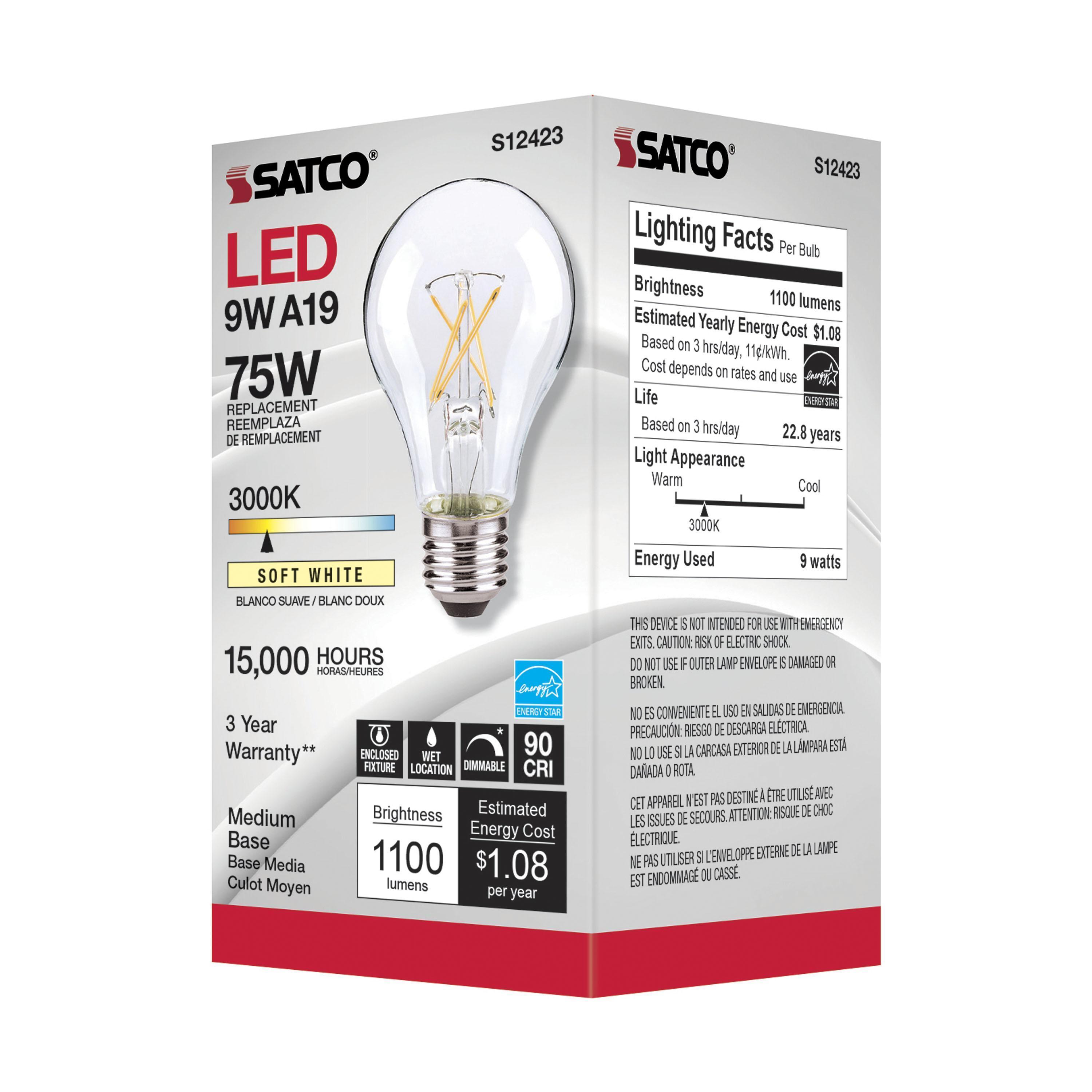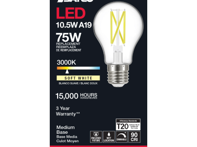 The most common, useful lamps on the market are now suitable for use nationwide with their 90 CRI T20 CEC rating. Our LED A15 and A19 LED filament lamps incorporate all the latest LED technologies for superior lumen output, efficiency and long life wherever they're used!|Satco's S12423 10.5-watt A19 lamp is a sleek lighting solution for the home. The clear, dimmable bulb is perfect for living rooms, dining rooms, and office spaces. This energy efficient lighting solution delivers 15,000 hours of soft white light.