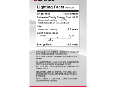 SATCO® LED Lamp, TRIAC Dimmable, 10.5A19/CL/LED/E26/930/120V Designation, 10.5 W Wattage, 75 W Incandescent Equivalent, 120 V, E26 Lamp Base, A19 Shape, 1100 Lumens, 15000 hr Average Life, Soft White, 90 CRI, 3000 K Color Temperature, Clear Lamp, Enclosed Fixture, 320 deg Beam, 2.36 in Dia x 4.02 in L Dimensions