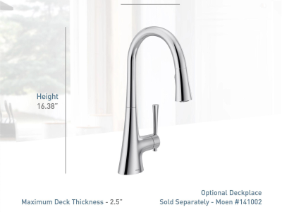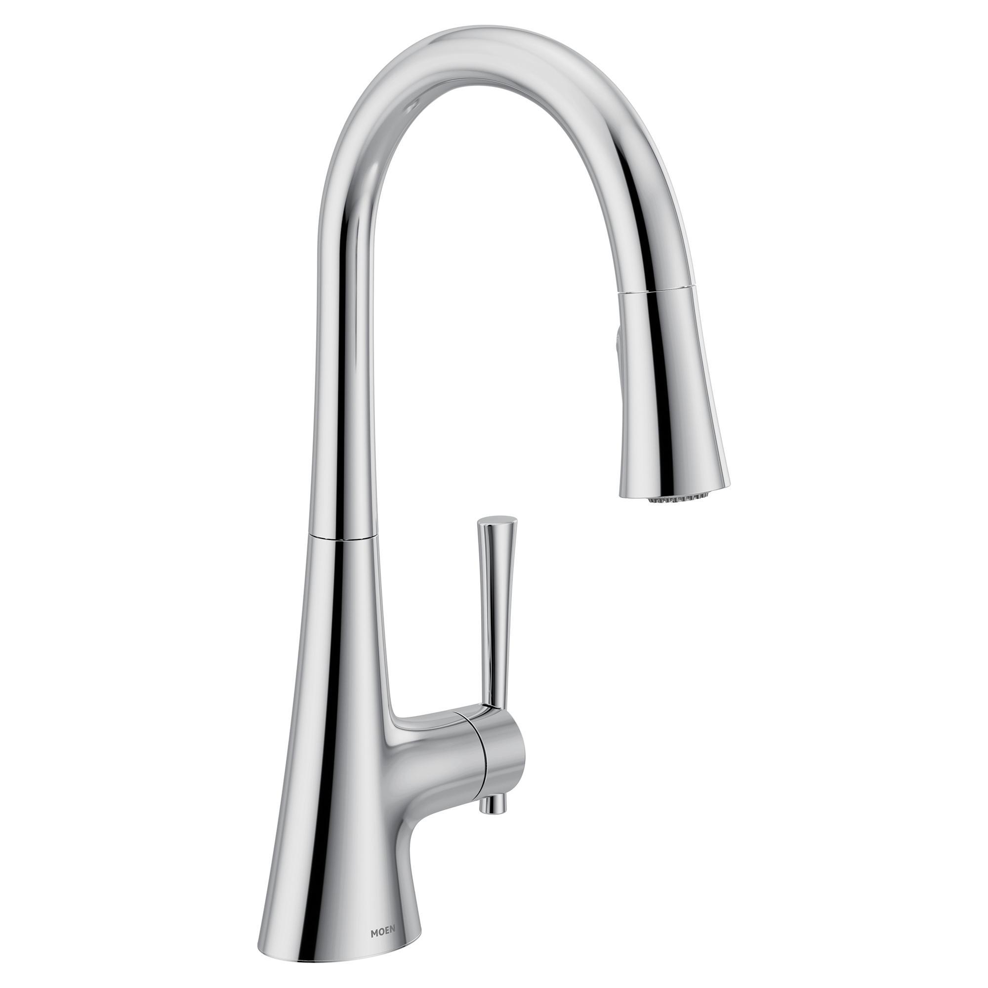 Moen® Pulldown Kitchen Faucet, Series: 9126 Series, Kurv™ Collection, 1.5 gpm Flow Rate, 360 deg High-Arc Spout, 7-15/16 in Spout Reach, 9-3/16 in Spout Height, 68 in L Hose, Lever Handle, 1 Handles, 1/3 Faucet Holes, 1-1/2 in Faucet Hole, 3/8 in Connection, Compression Connection, Spray Pattern: Aerated Stream/Boosted Rinse/Boosted Stream/Powerful Cleaning Rinse, 4 Spray Functions, 2-1/2 in Maximum Deck Thickness, Deck Mounting, 1255™ Duralast™ Cartridge, 16-3/8 in H Dimensions, Metal, Polished Chrome, Domestic