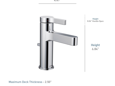 Moen® Bathroom Faucet, Vichy™, 1.2 gpm, Fixed Spout, 4-15/32 in Spout Reach, 4-1/16 in Spout Height, Lever, 1 Handle, Pop-Up Drain, 1 Faucet Hole, 3/8 in, Compression, Function: Traditional, 2-1/2 in Maximum Deck Thickness, Deck Mount, 1255® Duralast® Ceramic Disc Valve/Cartridge, 1.73 in W x 5.35 in D x 6.85 in H, Metal, Polished Chrome, Import